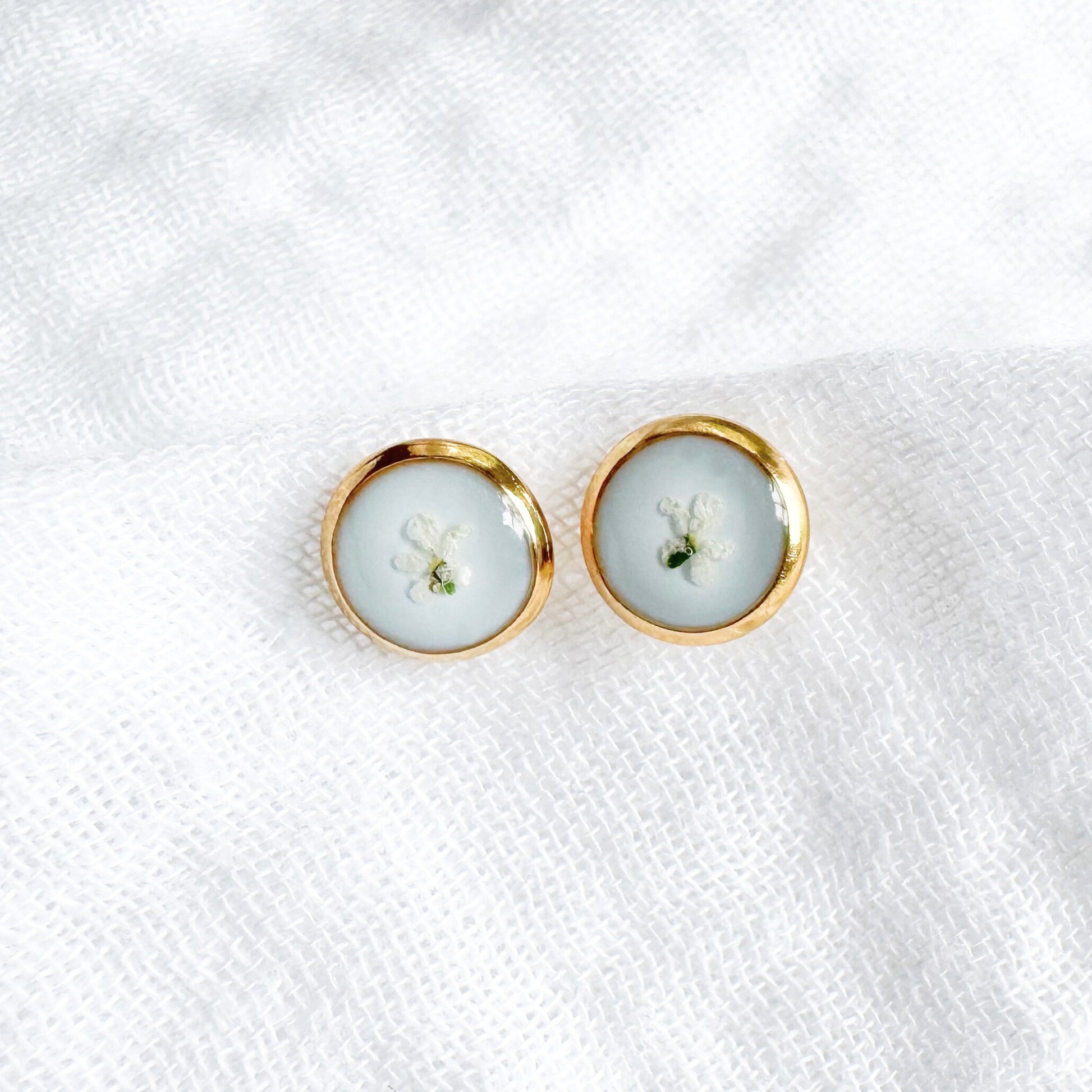 These dainty pressed flower earrings feature delicate Queen Anne's lace blooms cast against an airy blue backdrop. These real pressed flowers are housed in classic round earring studs.