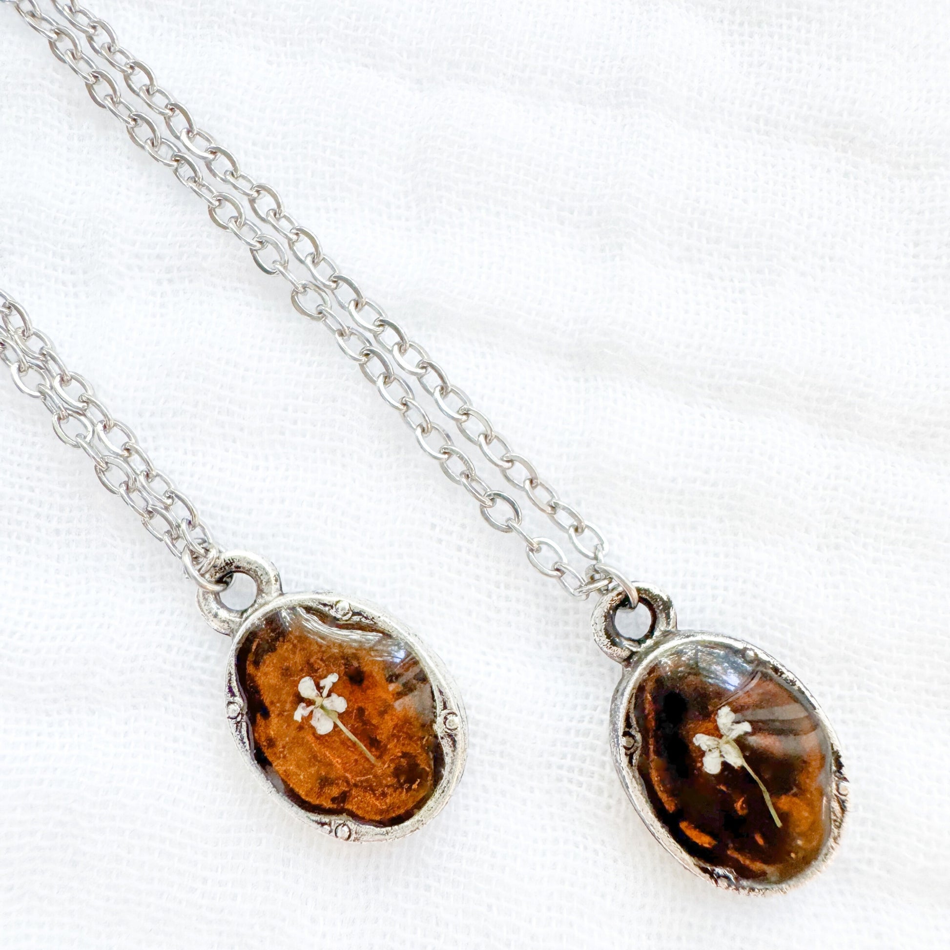 A dainty pressed flower necklace featuring a delicate Queen Anne's lace bloom cast against a brownish-orange, shimmering amber backdrop. These real pressed flowers are housed in an elegant, antique style pendant.