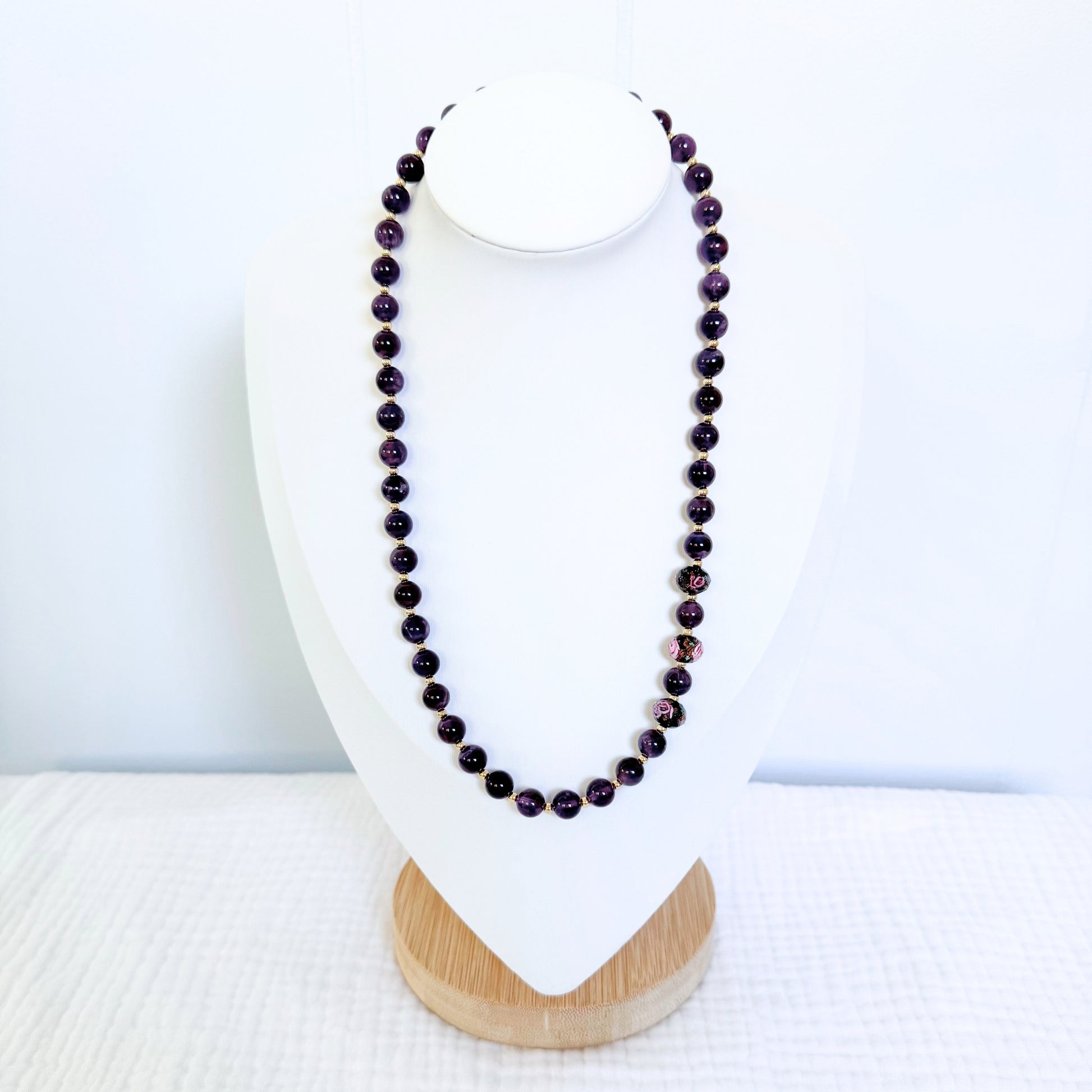 Make a statement with this gorgeous semi-precious necklace made with smooth, genuine natural amethyst gemstones, 14k gold plated beads, and sparkling faceted glass rose lampwork beads.