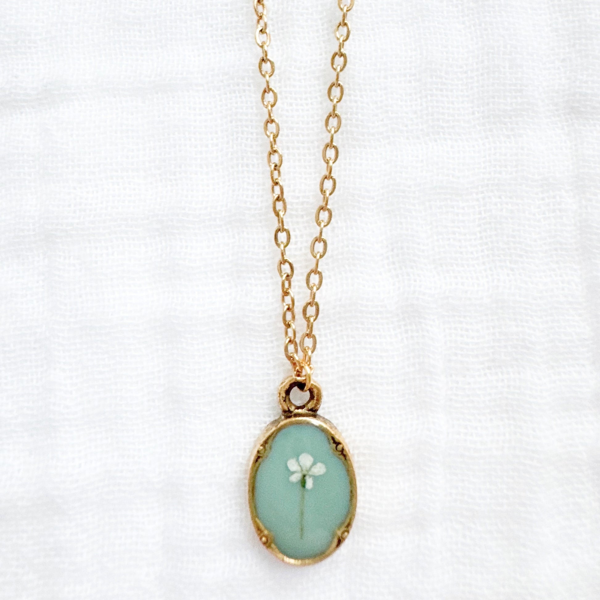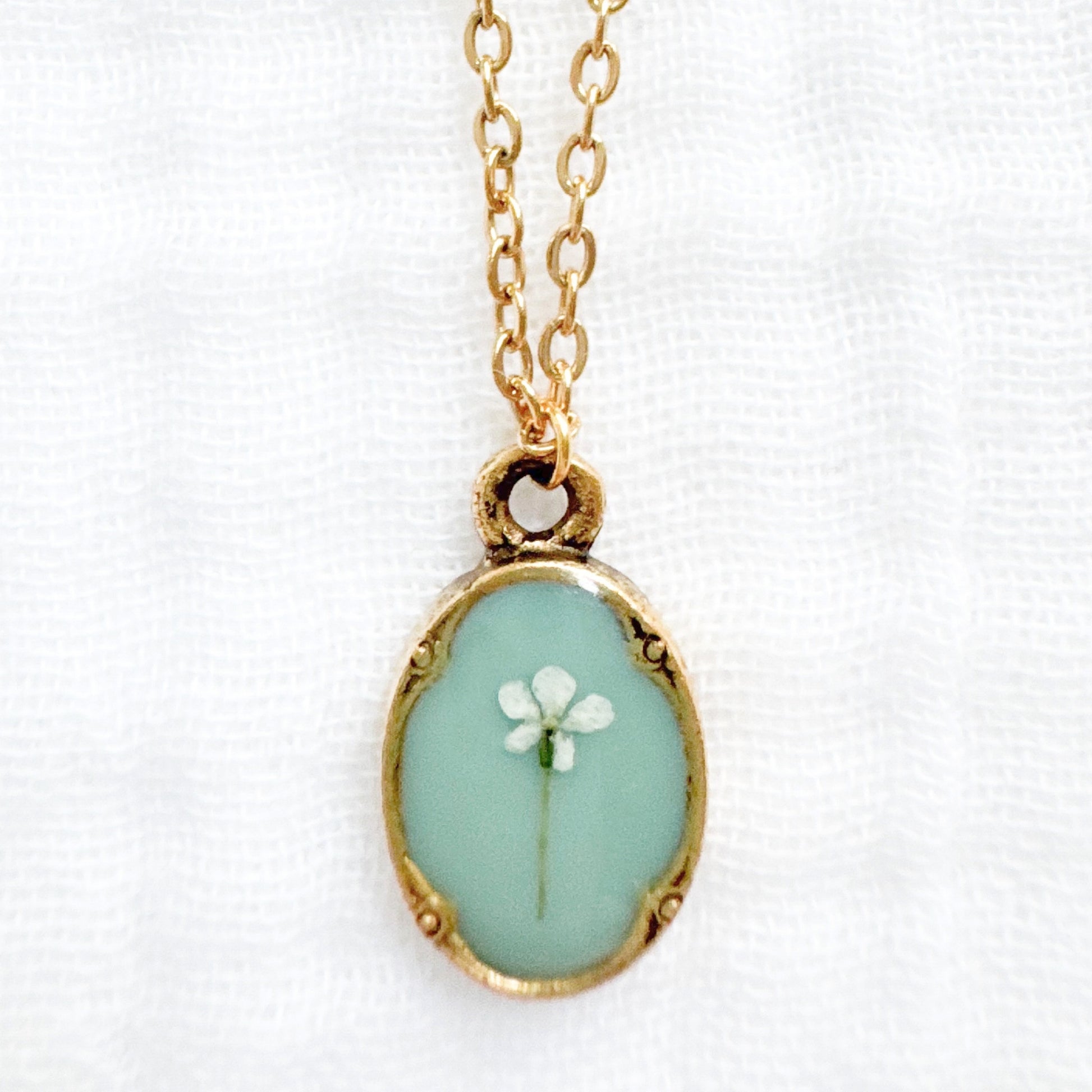 A dainty pressed flower necklace featuring a delicate Queen Anne's lace bloom cast against a sea foam green backdrop. These real pressed flowers are housed in an elegant, antique style pendant.