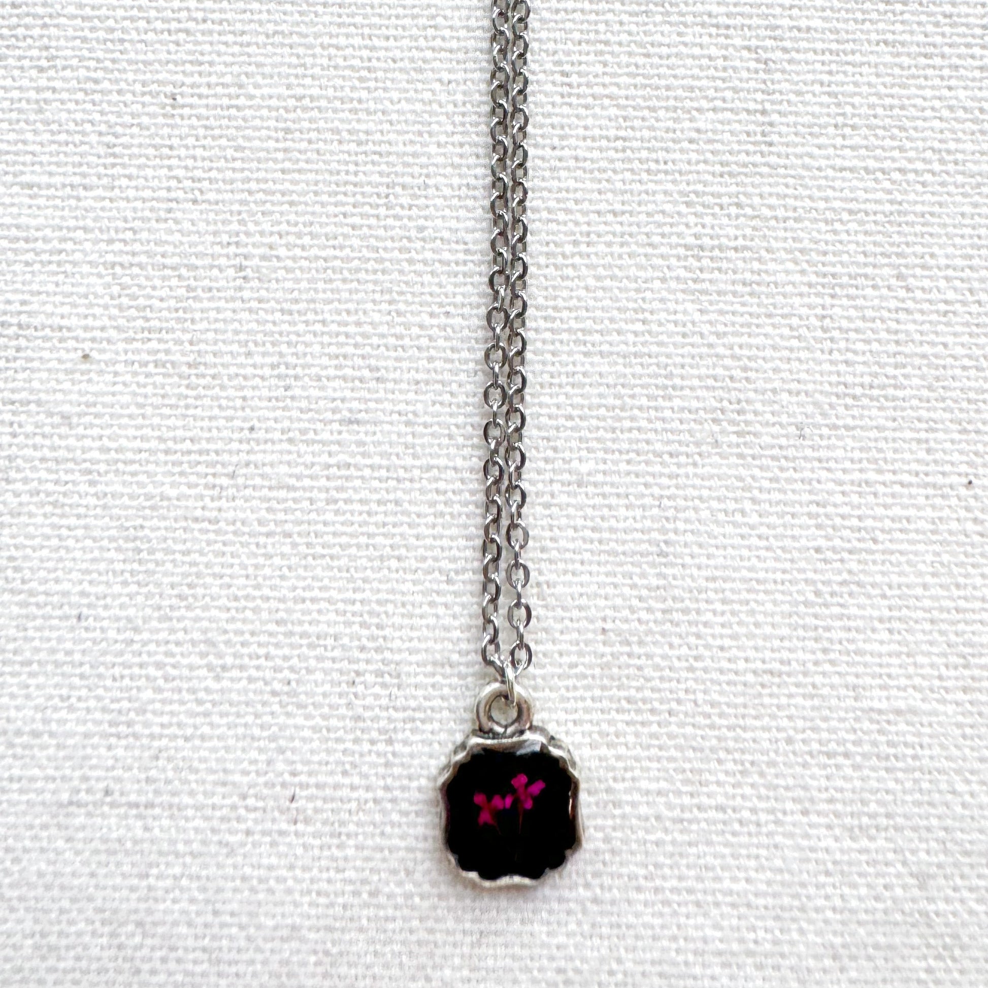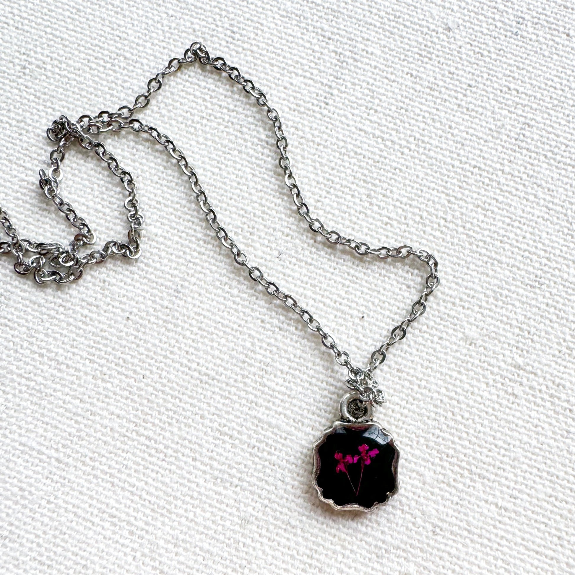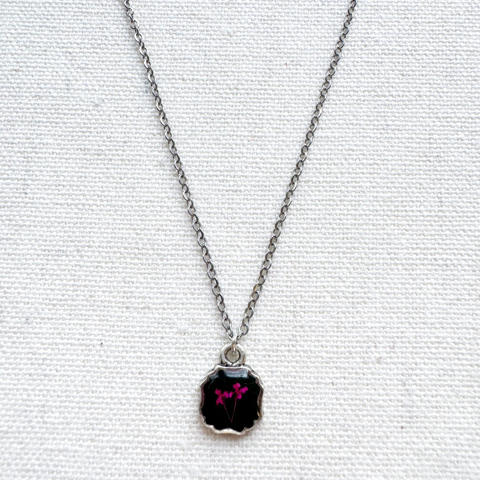 A dainty pressed flower necklace featuring delicate pink flowers cast against an ebony backdrop. These real pressed flowers are housed in an elegant, antique style pendant.