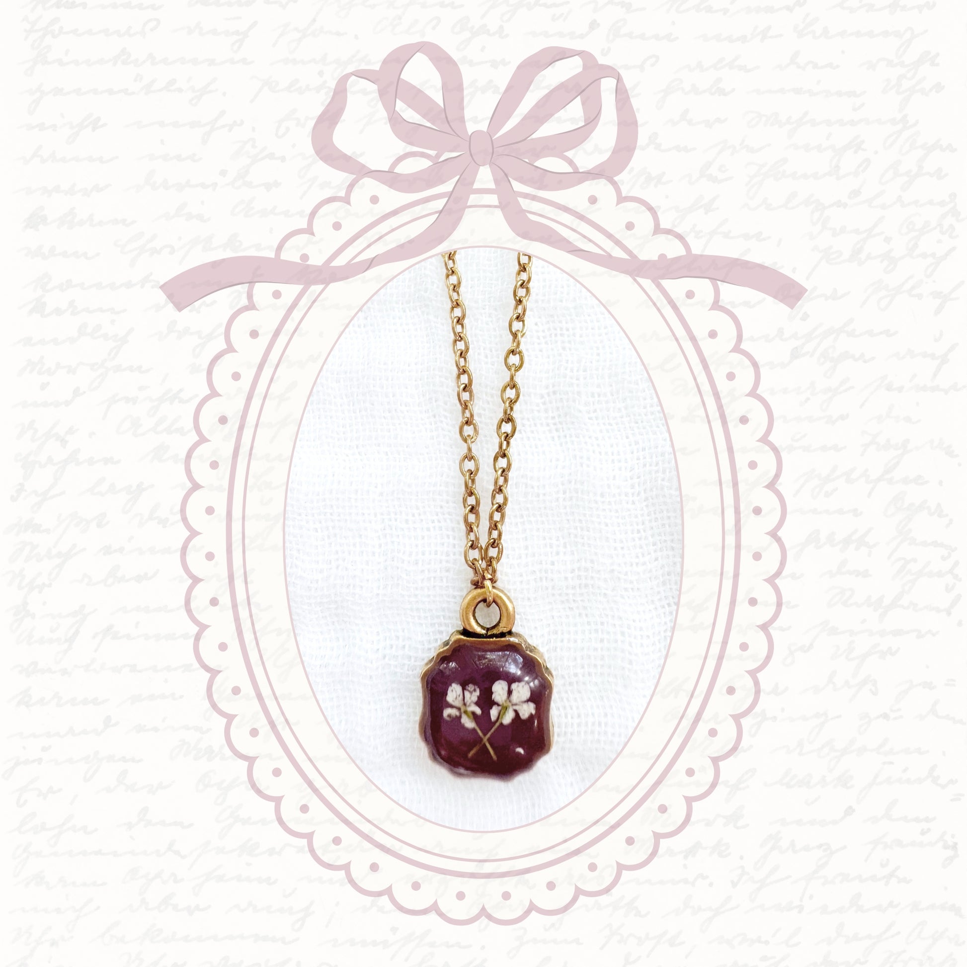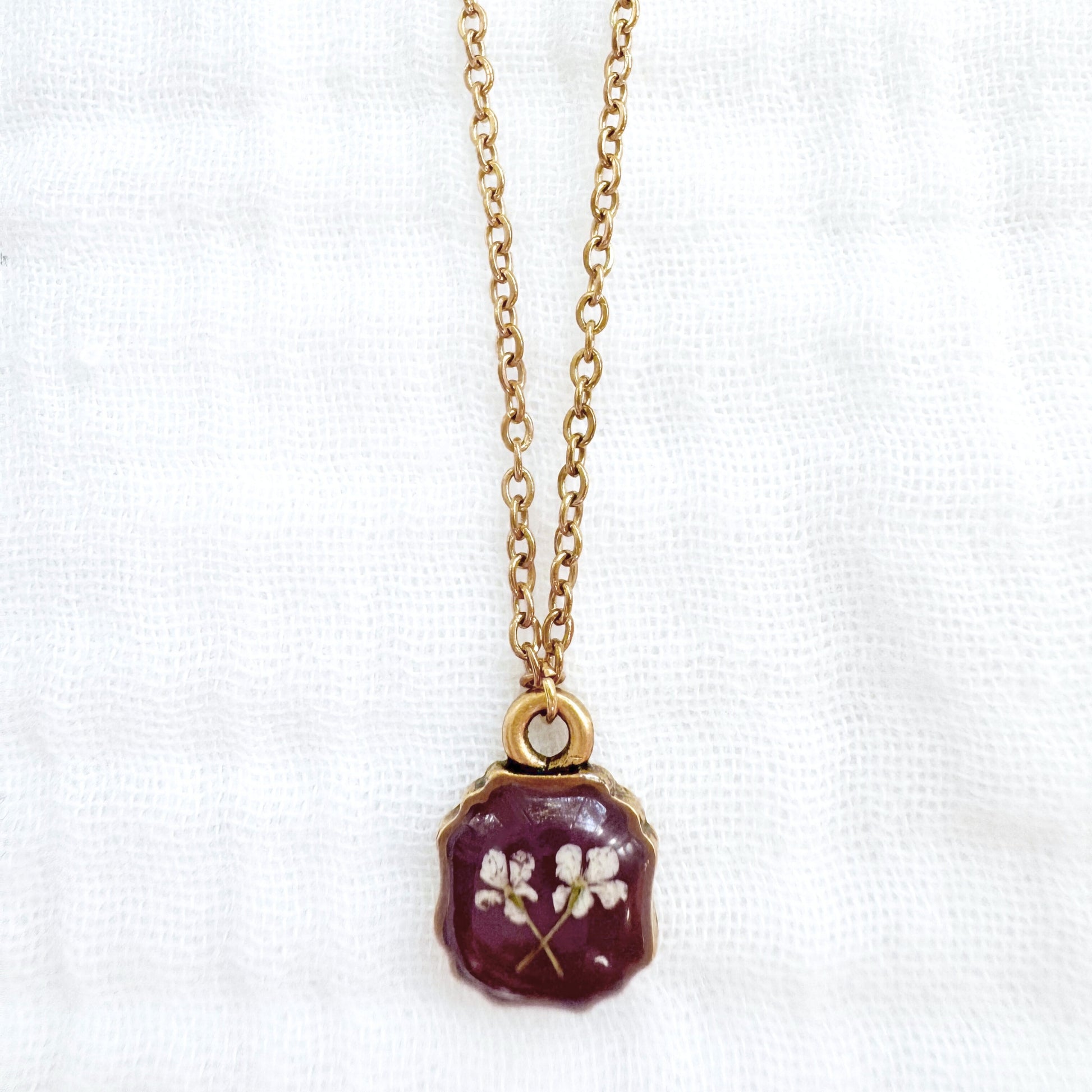 A dainty pressed flower necklace featuring a pair of Queen Anne's lace cast against a moody plum backdrop. These real pressed flowers are housed in an elegant, antique style pendant.