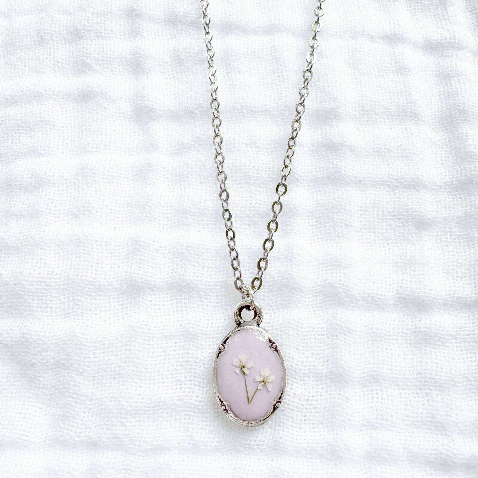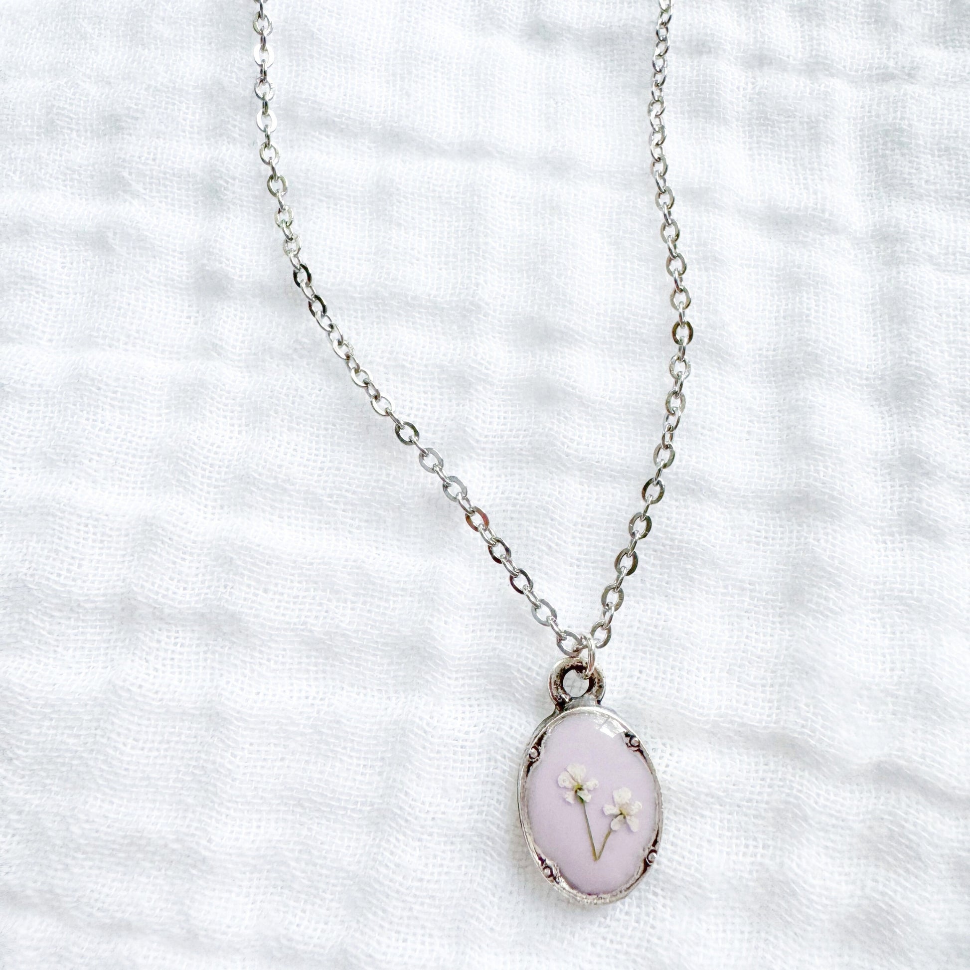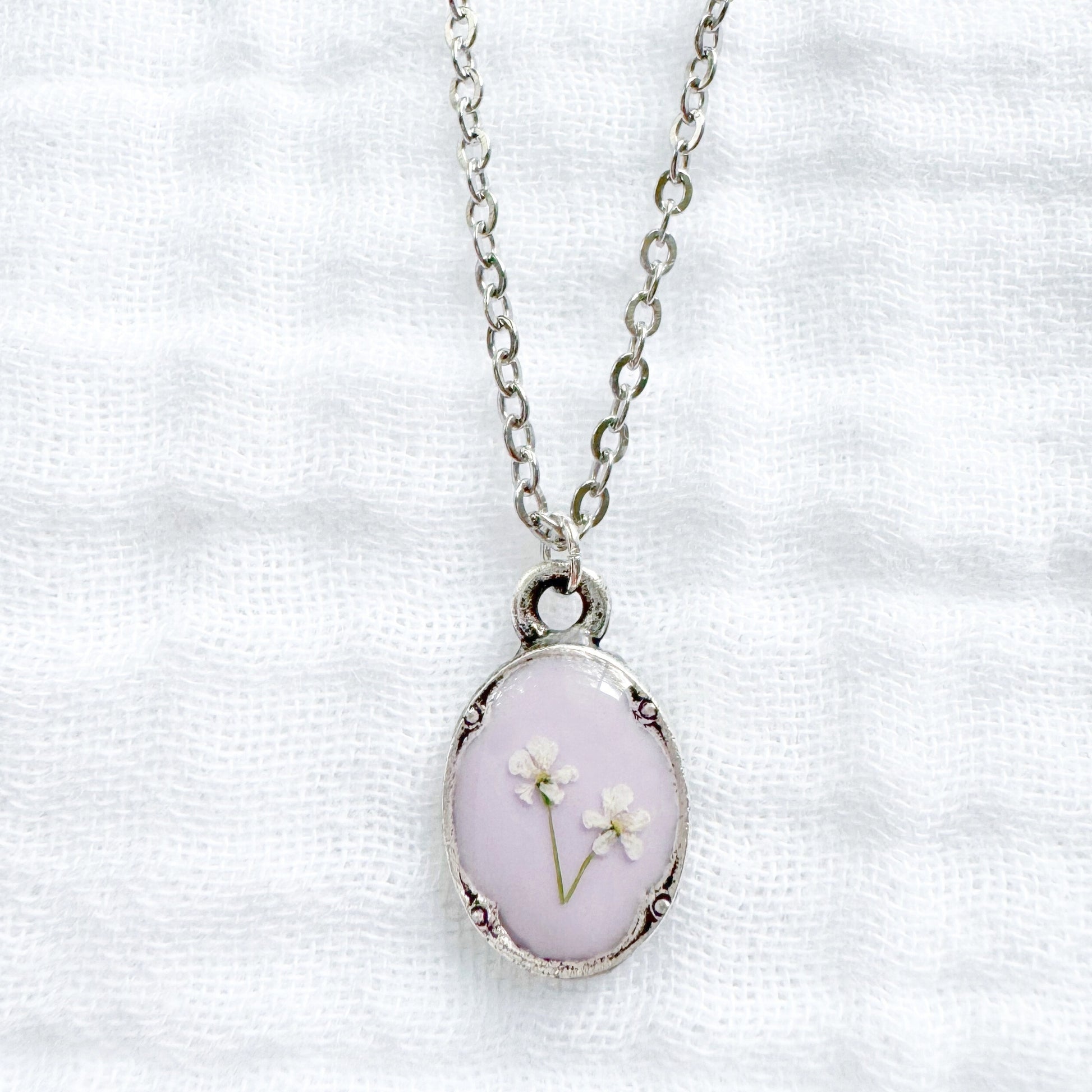 A dainty pressed flower necklace featuring a pair of Queen Anne's lace blooms cast against a soft lilac backdrop. These real pressed flowers are housed in an elegant, antique style pendant.