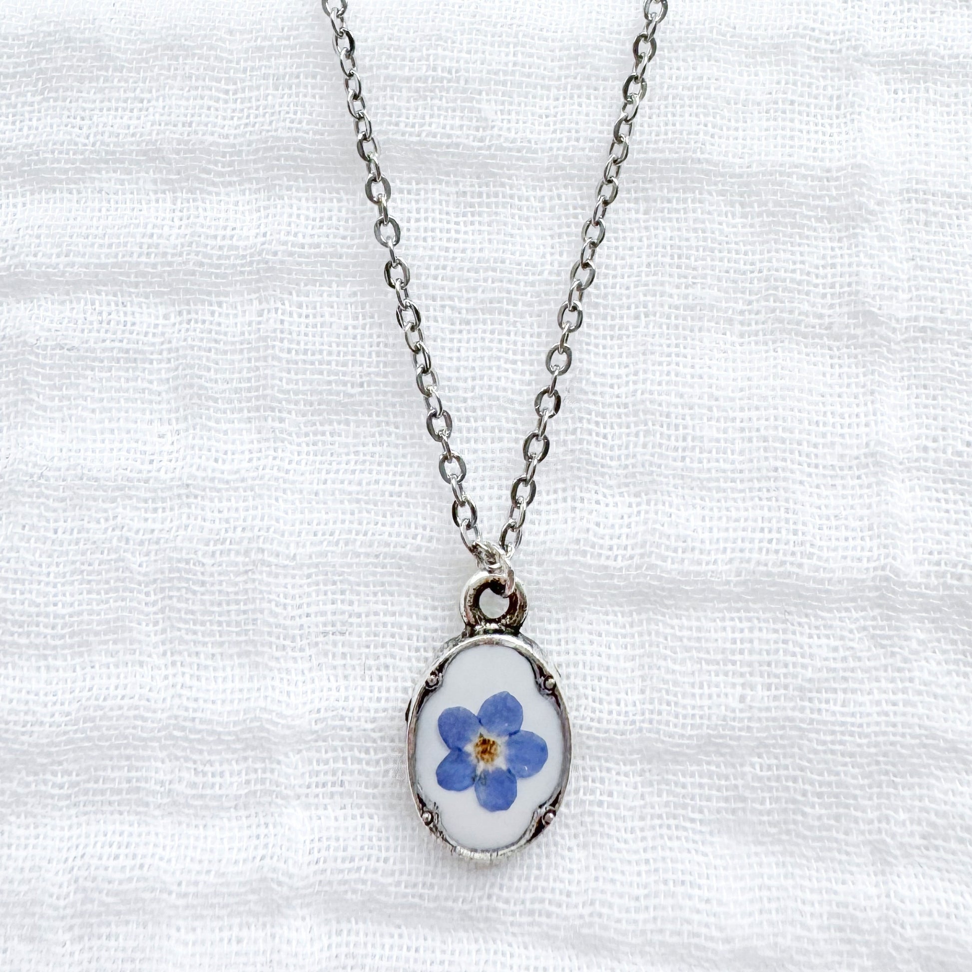 A dainty pressed flower necklace featuring a delicate Forget-me-not bloom cast against a snow white backdrop. These real petals are housed in an elegant, antique style pendant