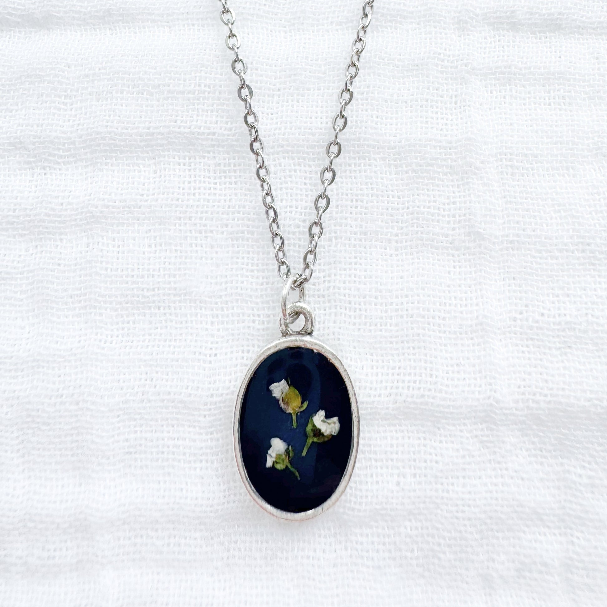 A dainty pressed flower necklace featuring trailing wildflowers cast against a midnight blue backdrop. These real pressed flowers are housed in a classic oval pendant.