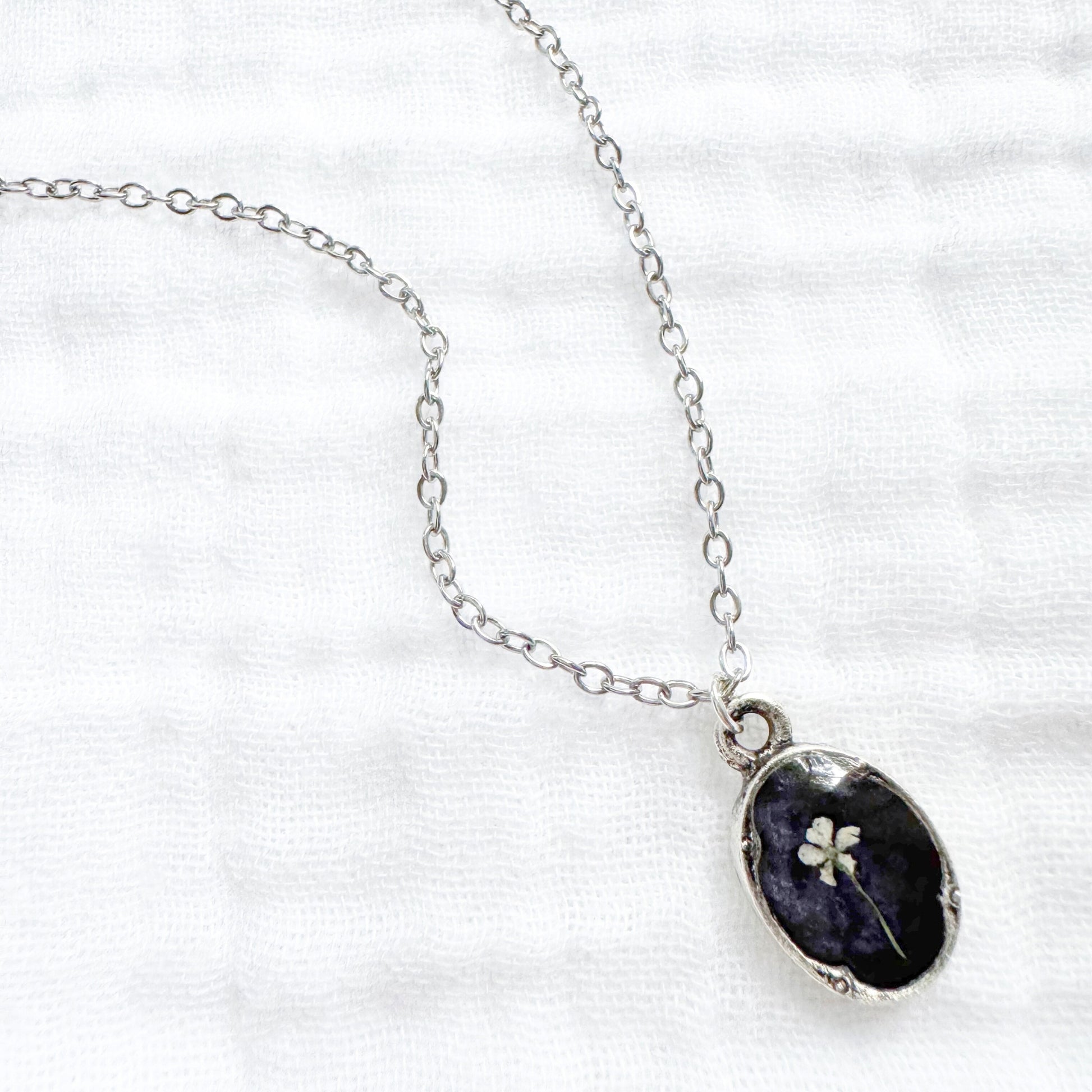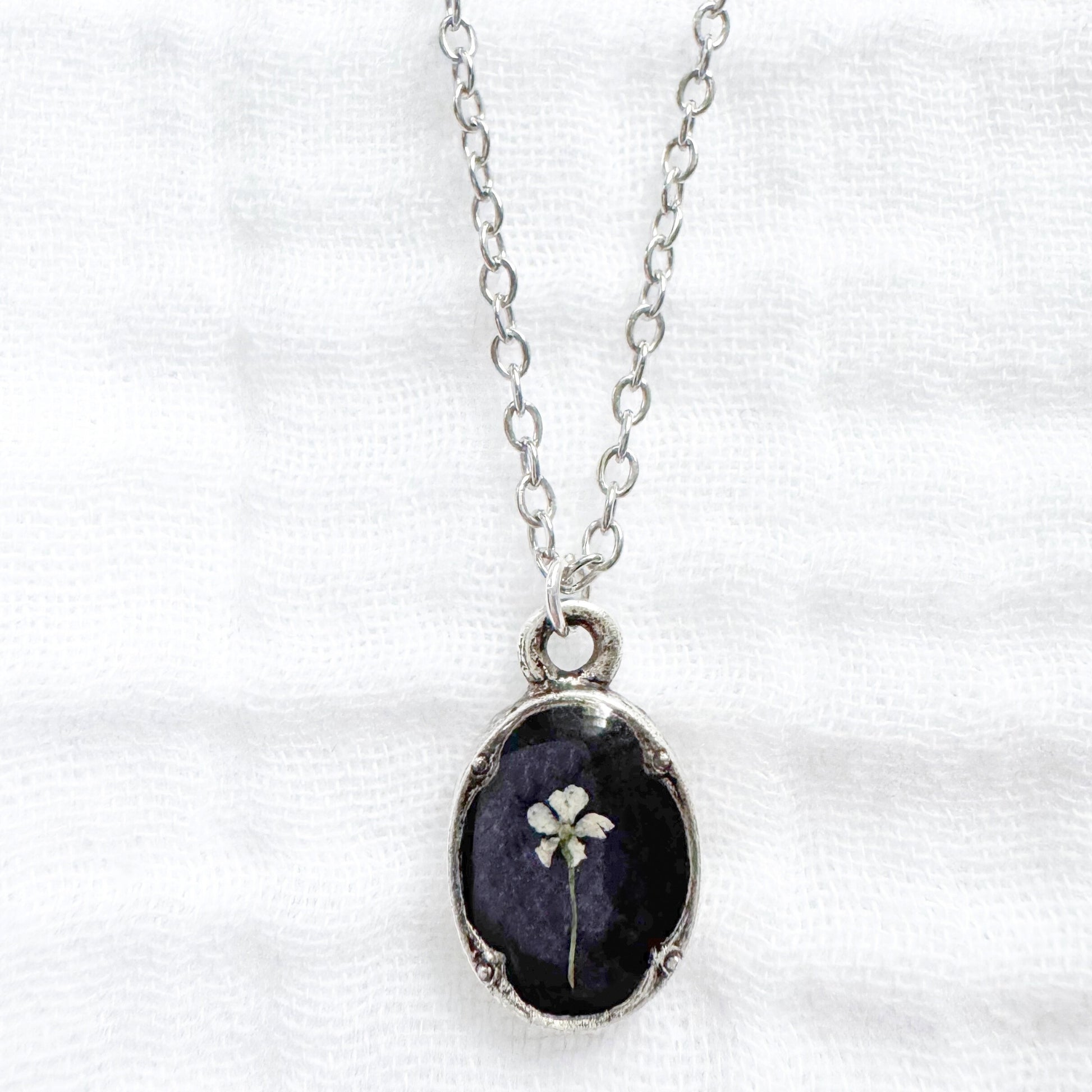 A dainty pressed flower necklace featuring a solitary Queen Anne's lace bloom cast against a shimmering ebony backdrop. These real pressed flowers are housed in an elegant, antique style pendant.