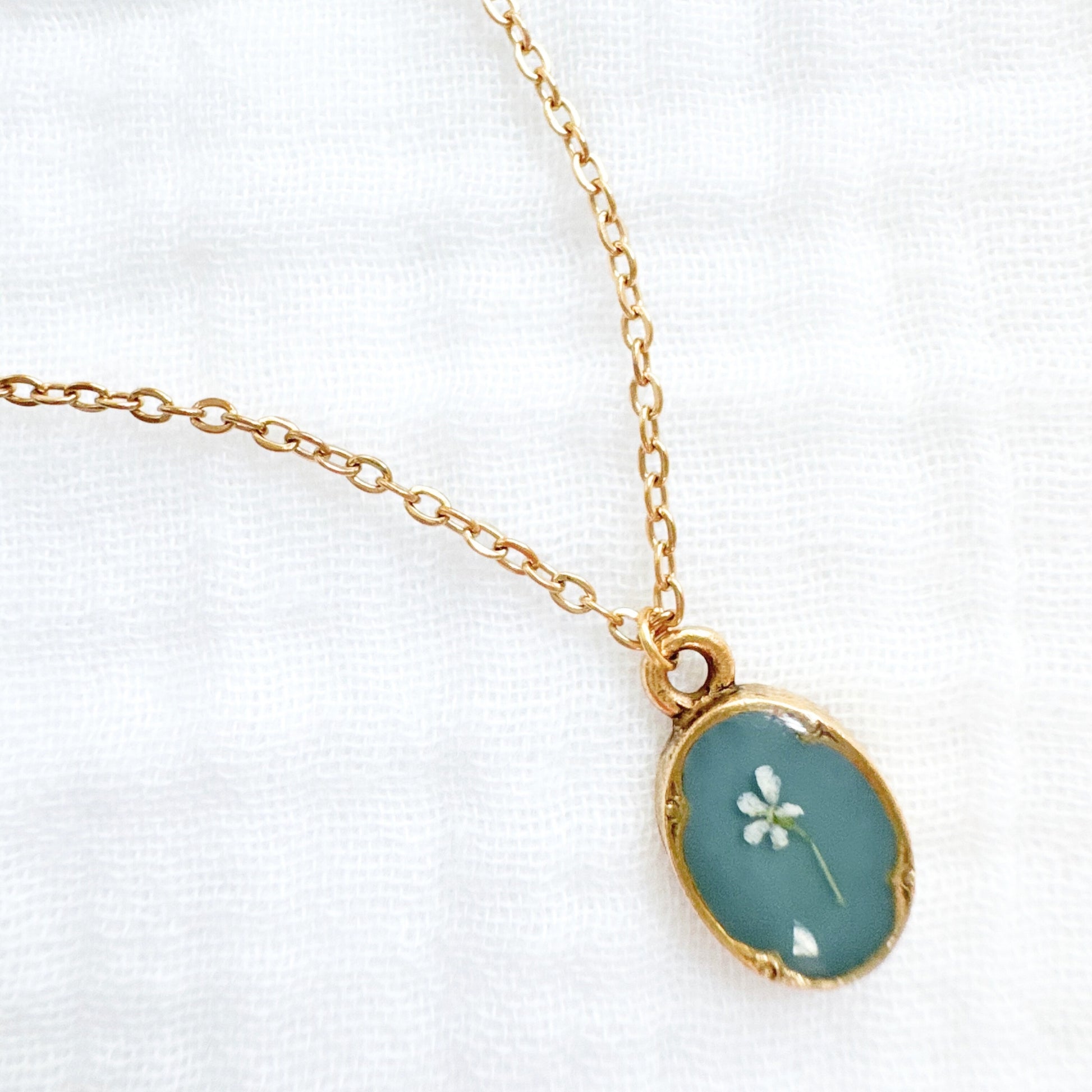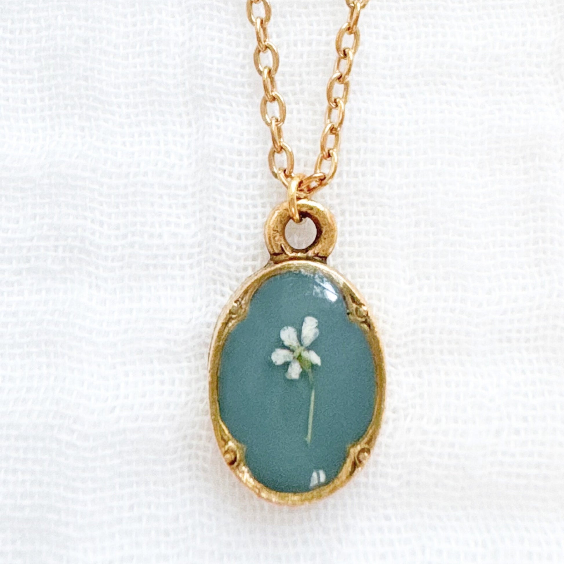 A dainty pressed flower necklace featuring a delicate Queen Anne's lace bloom cast against a forest green backdrop. These real pressed flowers are housed in an elegant, antique style pendant.