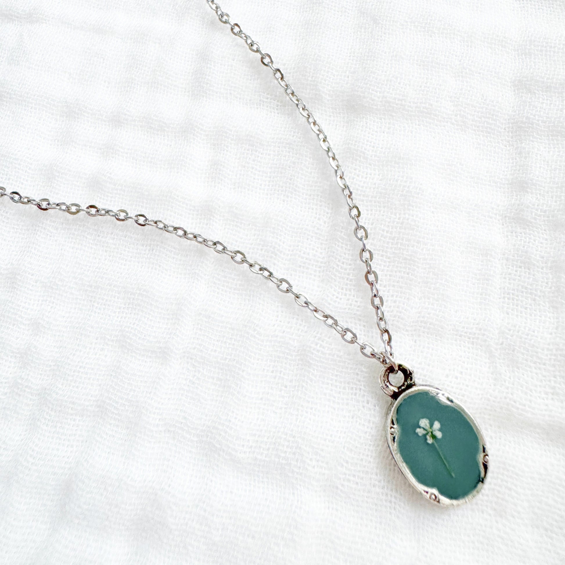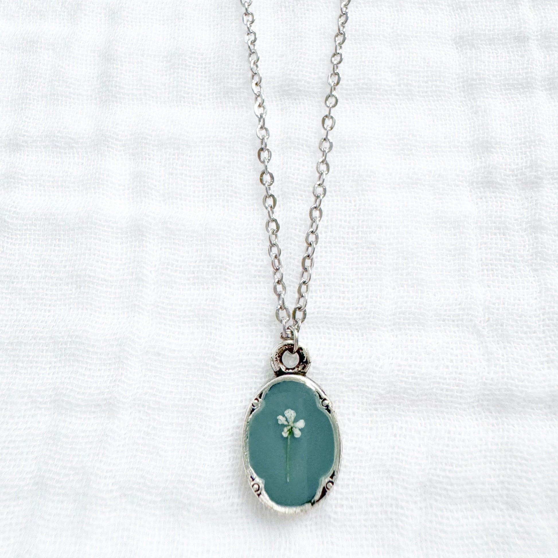 A dainty pressed flower necklace featuring a pair of delicate Queen Anne's lace cast against a forest green backdrop. These real pressed flowers are housed in an elegant, antique style pendant.