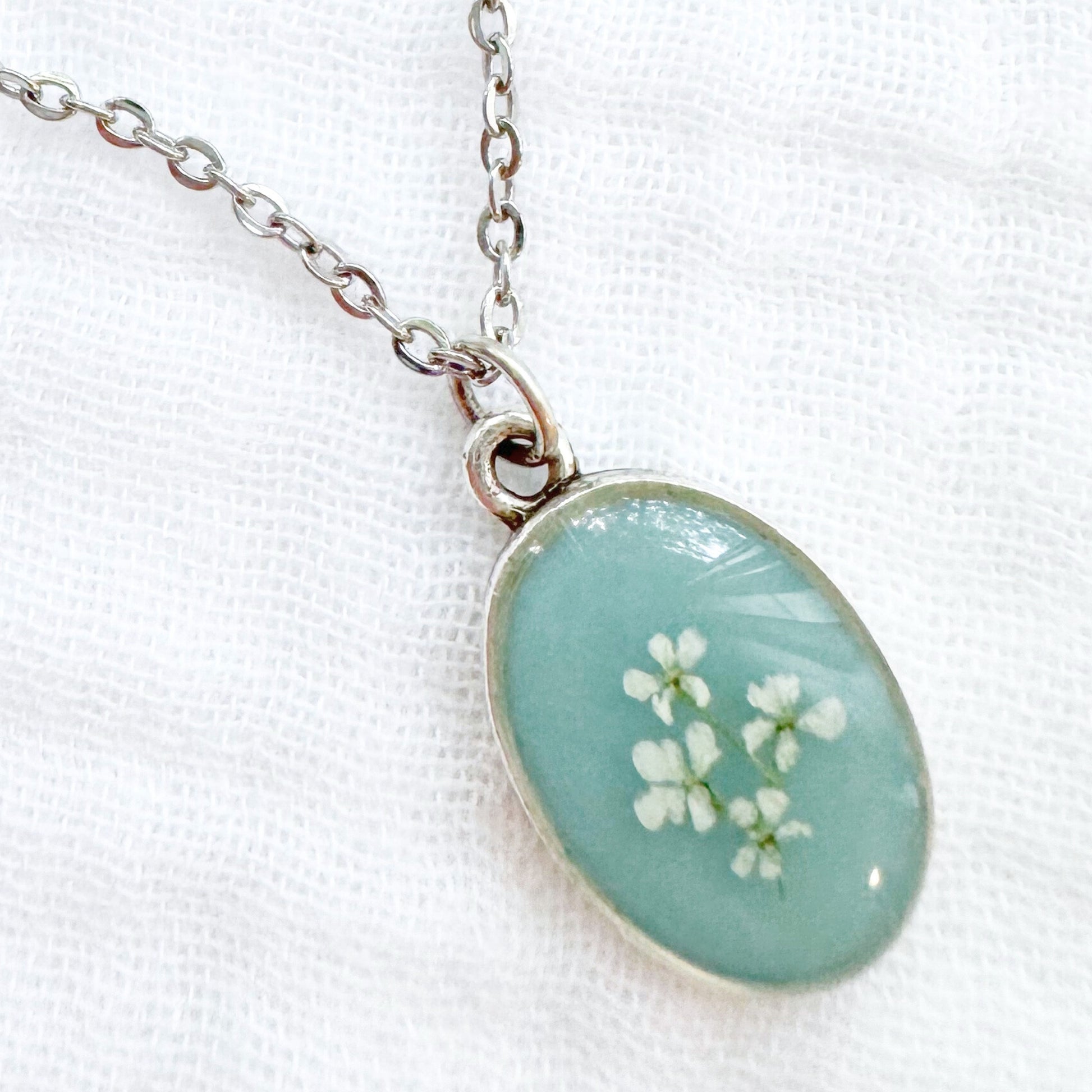 A dainty pressed flower necklace featuring a cluster of Queen Anne's lace blooms cast against a misty dawn backdrop. These real pressed flowers are housed in a classic oval pendant.