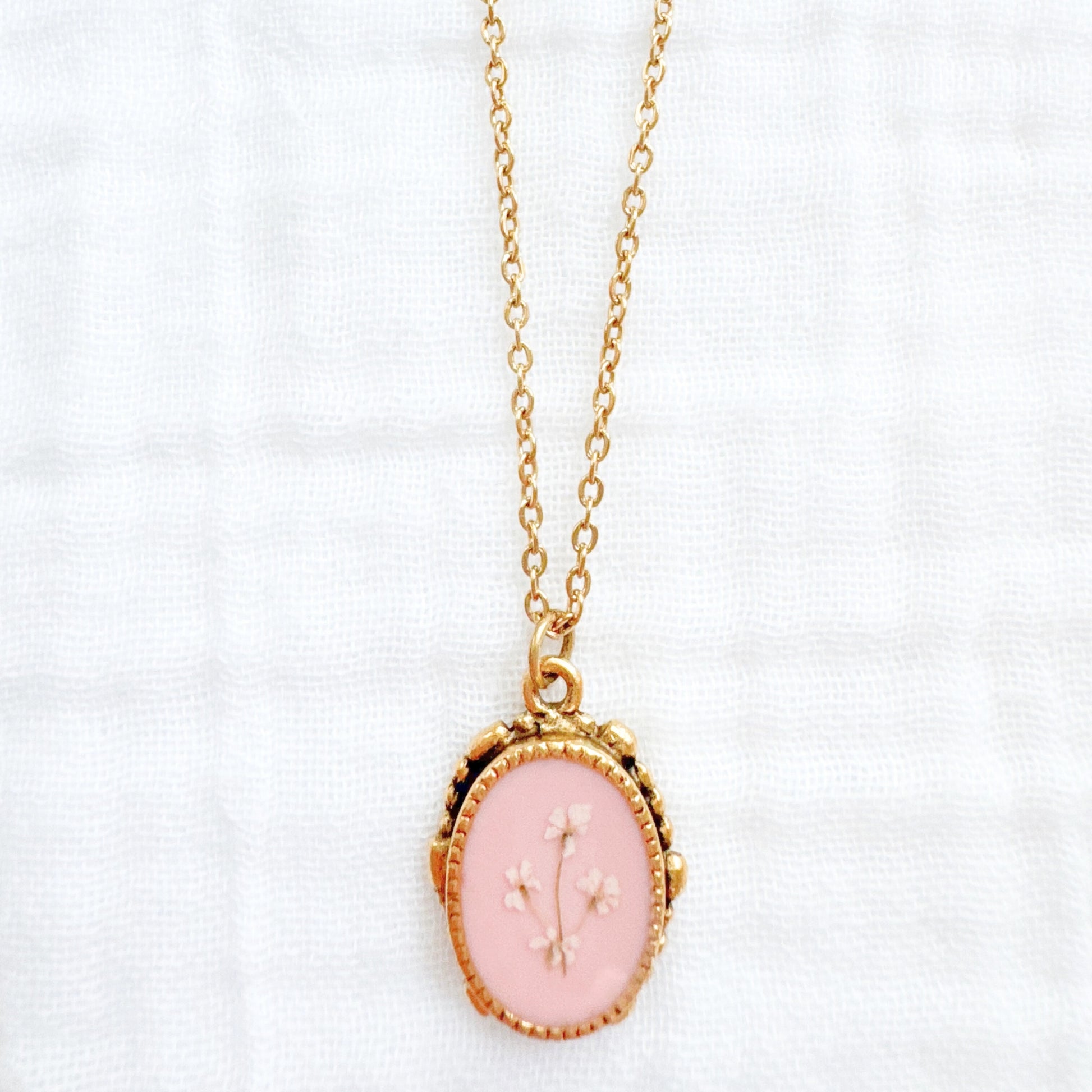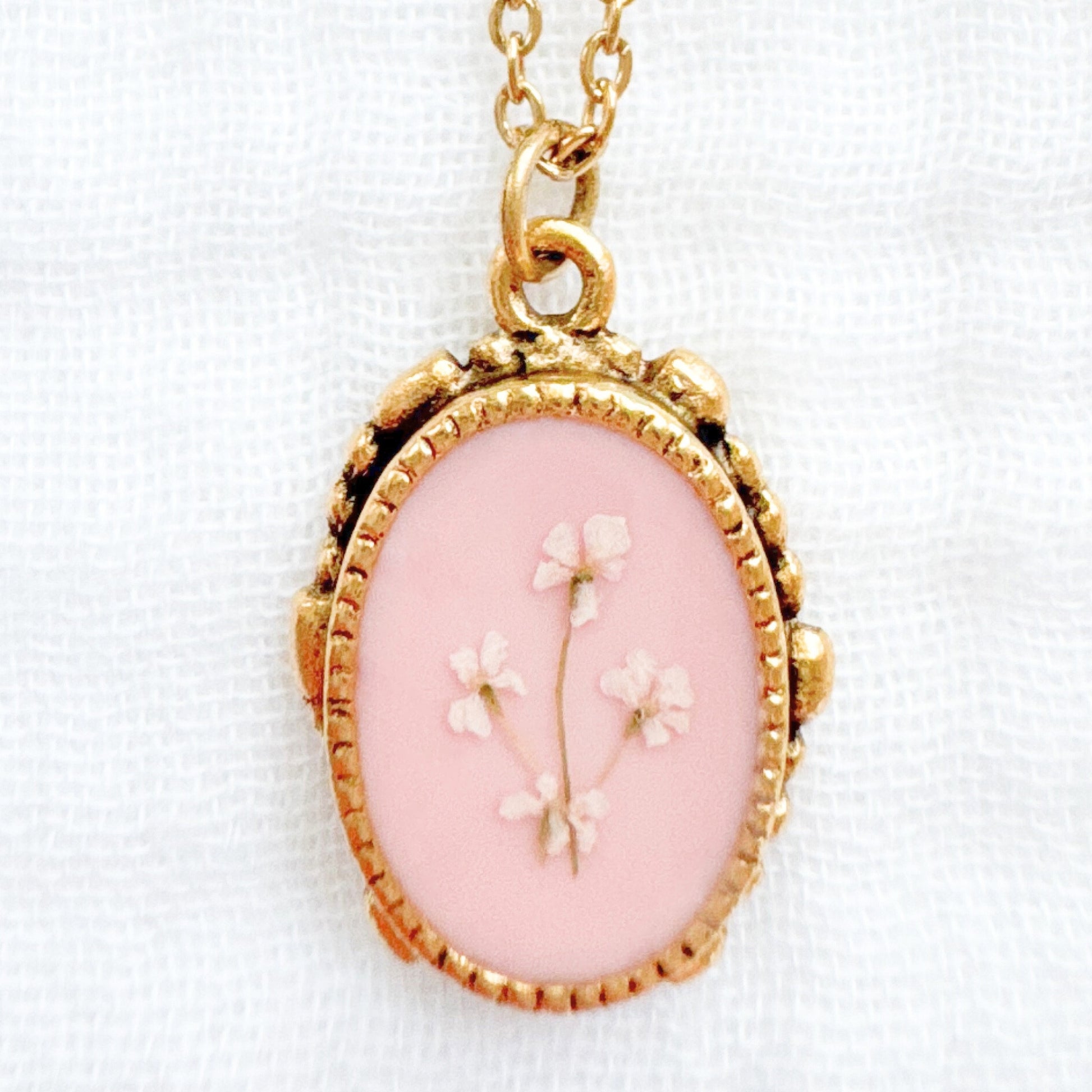 A dainty pressed flower necklace featuring four delicate Queen Anne's Lace cast against an icing pink backdrop. These real pressed flowers are housed in an elegant, antique style pendant.
