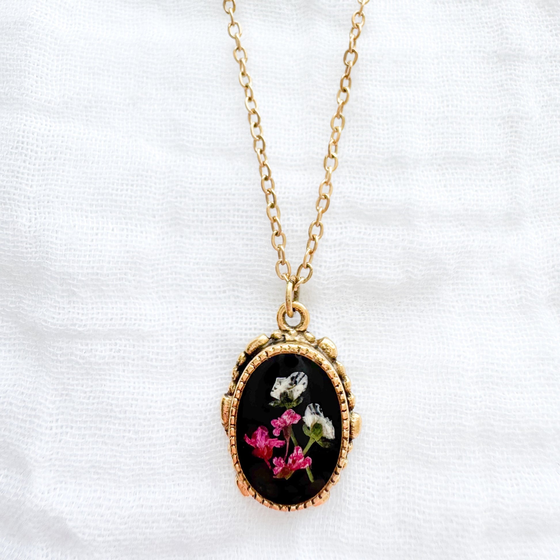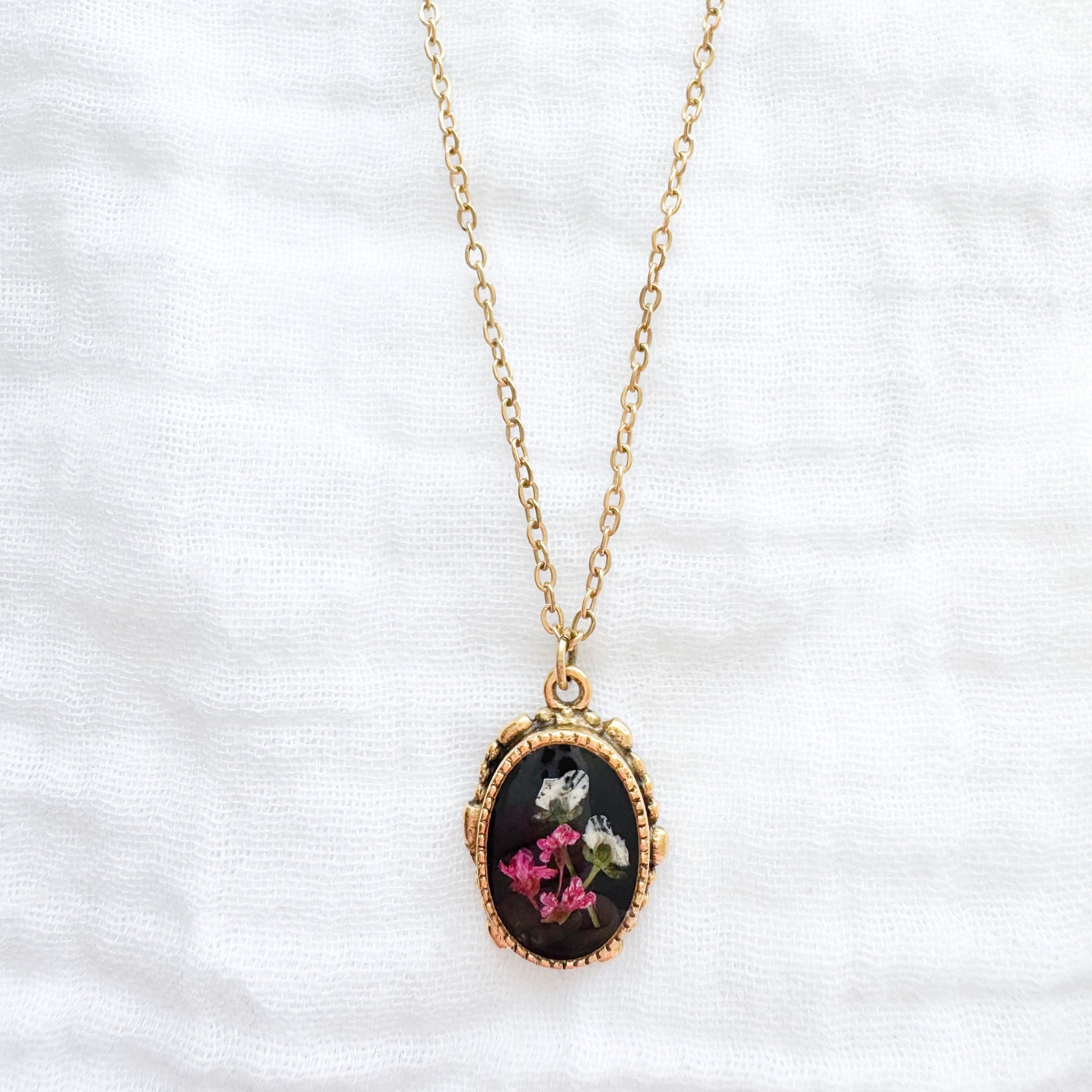 A dainty pressed flower necklace featuring a bouquet of wildflowers cast against an ebony backdrop. These real pressed flowers are housed in an elegant, antique style pendant.