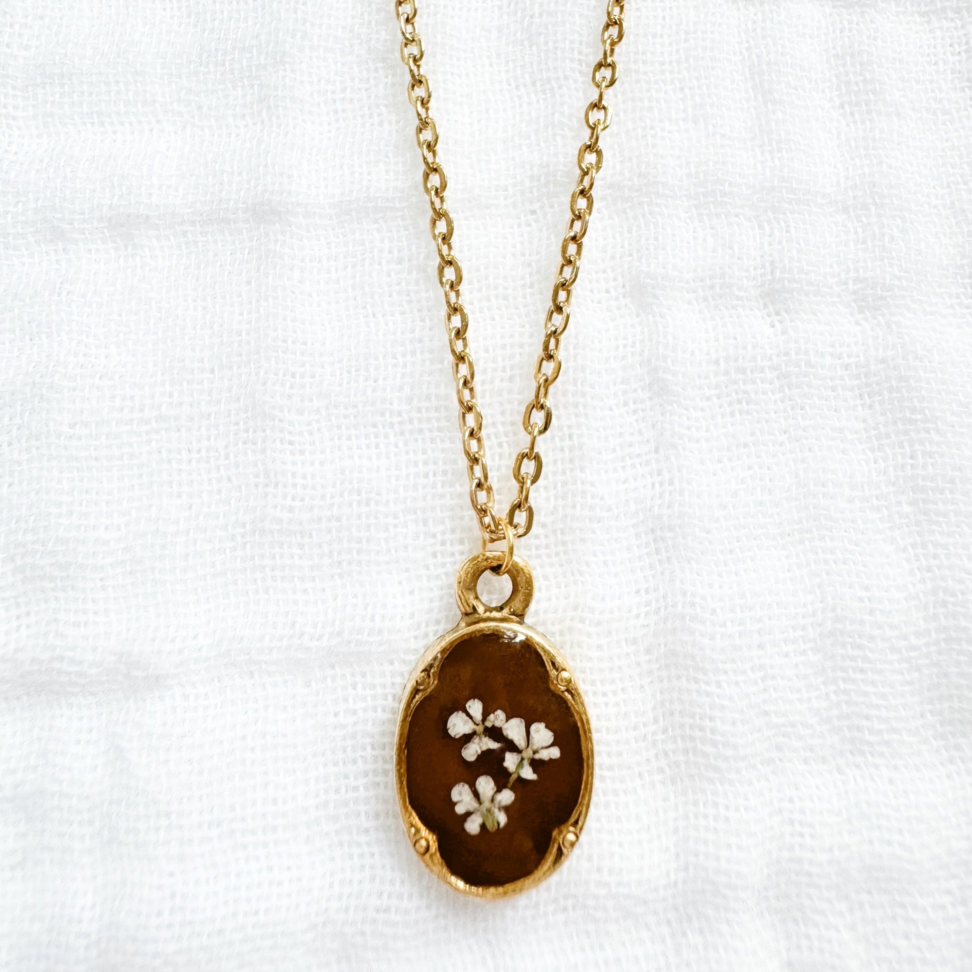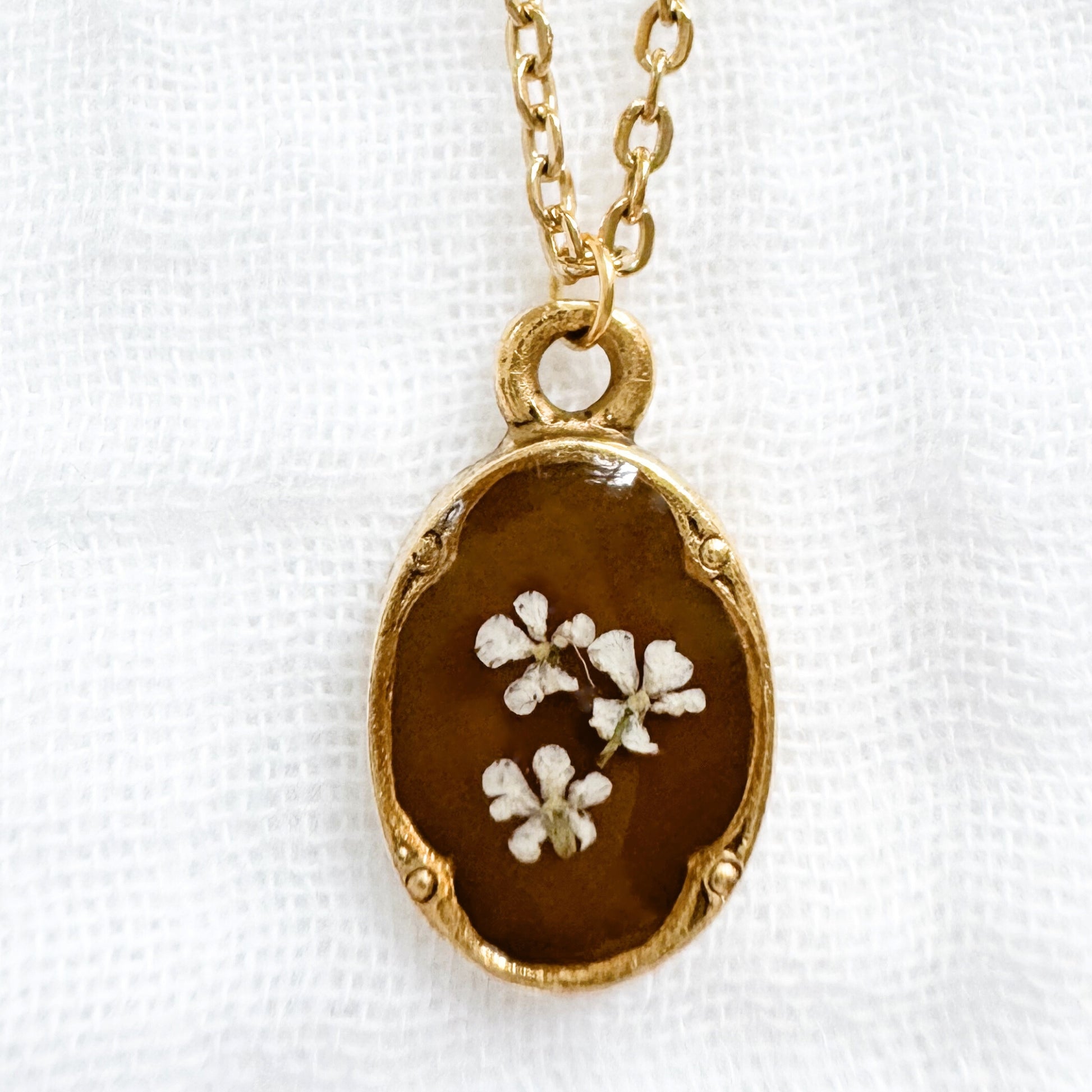 A dainty pressed flower necklace featuring a trio of delicate Queen Anne's lace cast against a chocolate brown backdrop. These real pressed flowers are housed in an elegant, antique style pendant.