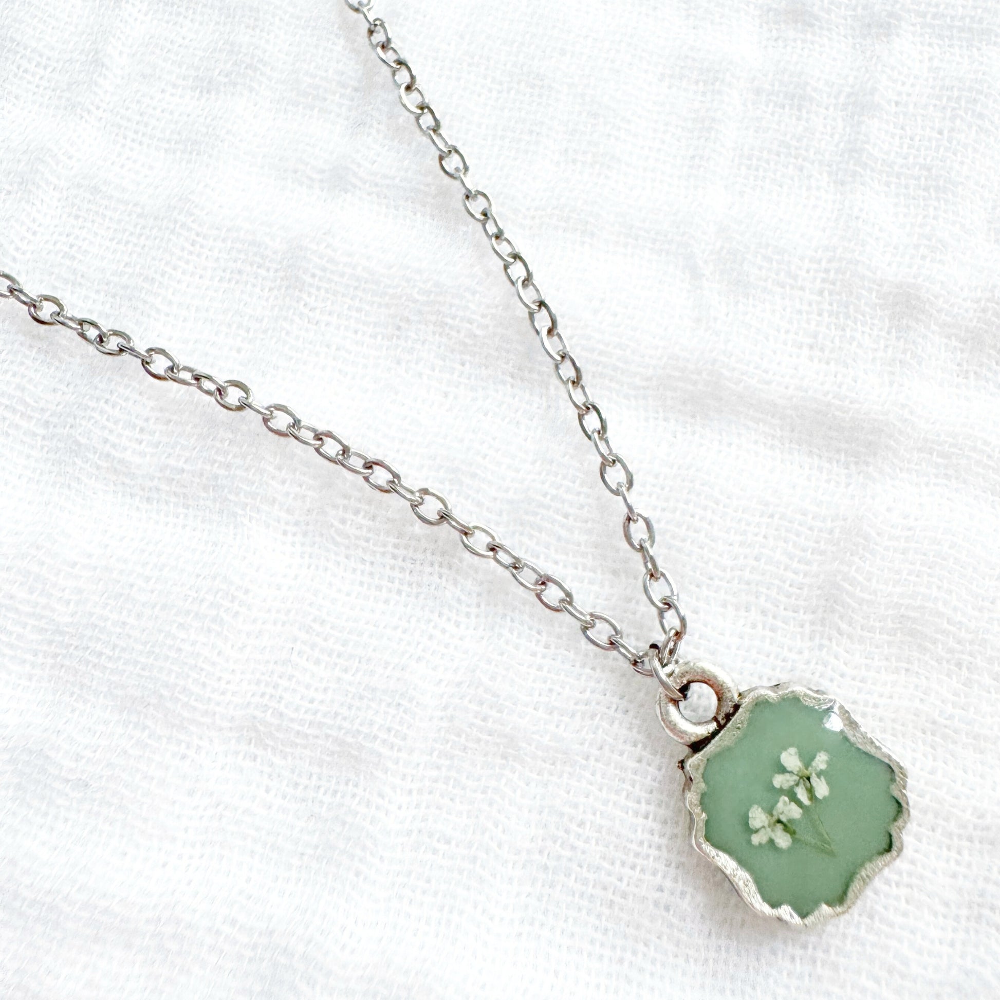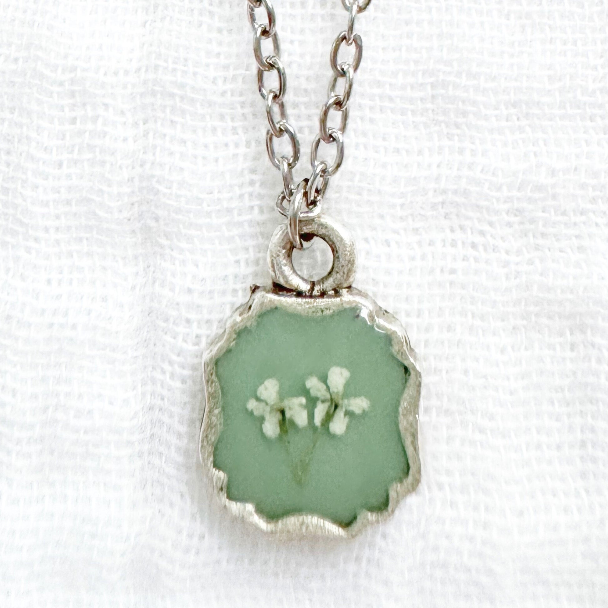 A dainty pressed flower necklace featuring a pair of delicate Queen Anne's lace cast against a light sage green backdrop. These real pressed flowers are housed in an elegant, antique style pendant.