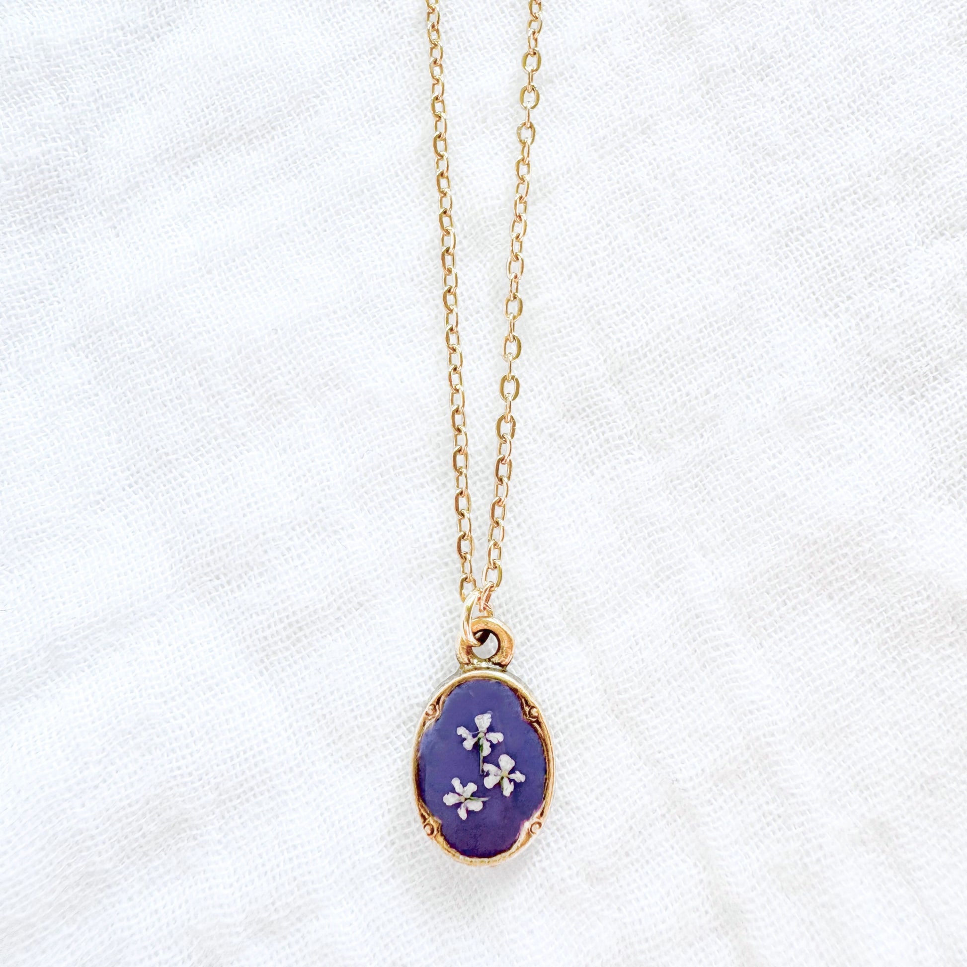 A dainty pressed flower necklace featuring a cascading trio of Queen Anne's lace blooms cast against a deep violet backdrop. These real pressed flowers are housed in an elegant, antique style pendant.