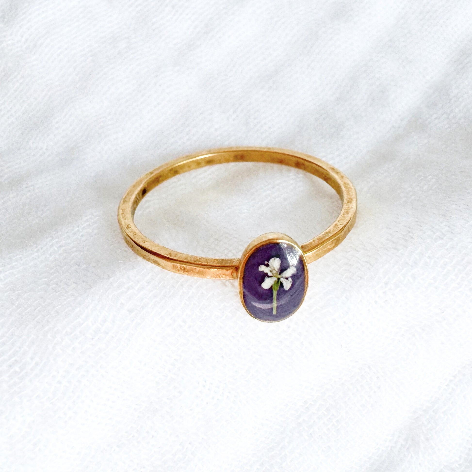This dainty pressed flower stacking ring features a single delicate Queen Anne's lace bloom cast against a deep violet backdrop. These real pressed petals are housed in a classic solitaire setting.