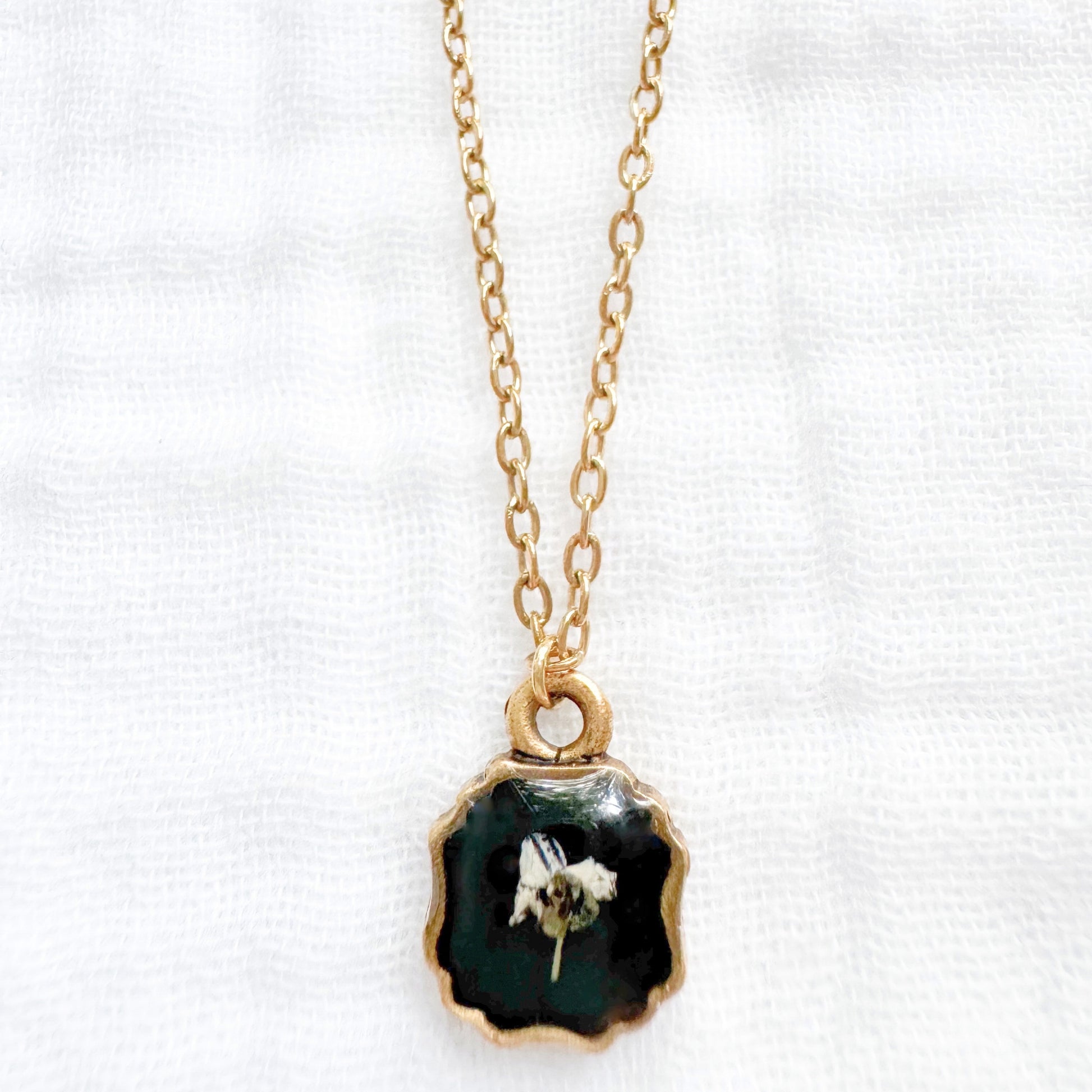 A dainty pressed flower necklace featuring a delicate wildflower cast against a shimmering emerald backdrop. Housed in an elegant, antique style pendant.