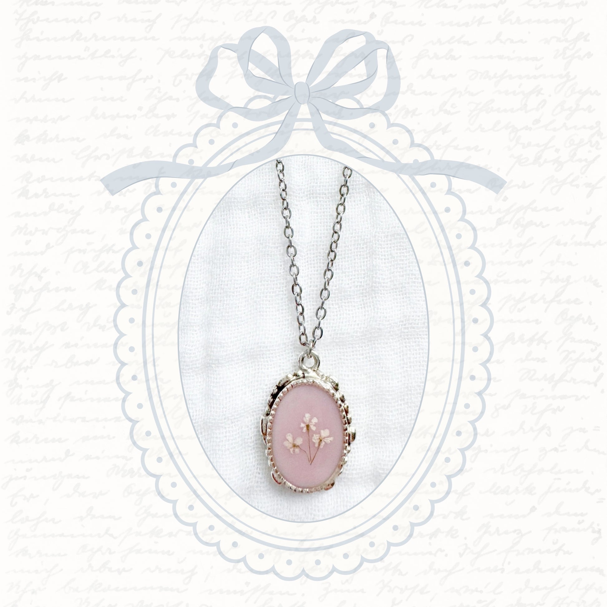 A dainty pressed flower necklace featuring a trio of delicate Queen Anne's lace cast against a dusty pink backdrop. These real pressed flowers are housed in an elegant, antique style pendant.
