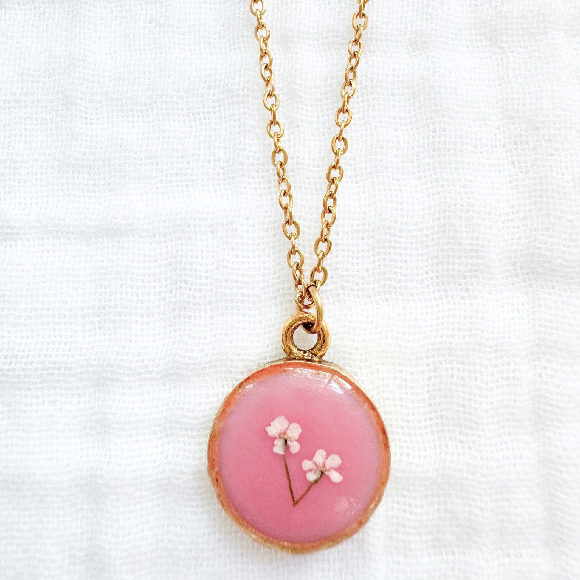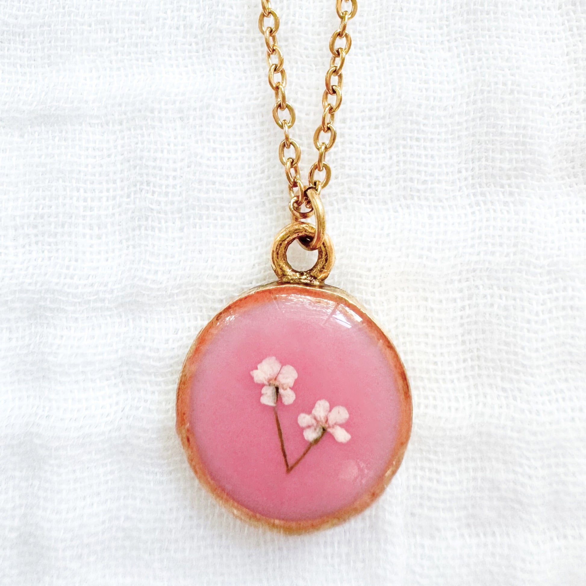 A dainty pressed flower necklace featuring a pair of delicate Queen Anne's lace blooms, cast against a watermelon pink backdrop. These real pressed flowers are housed in an antique style pendant.
