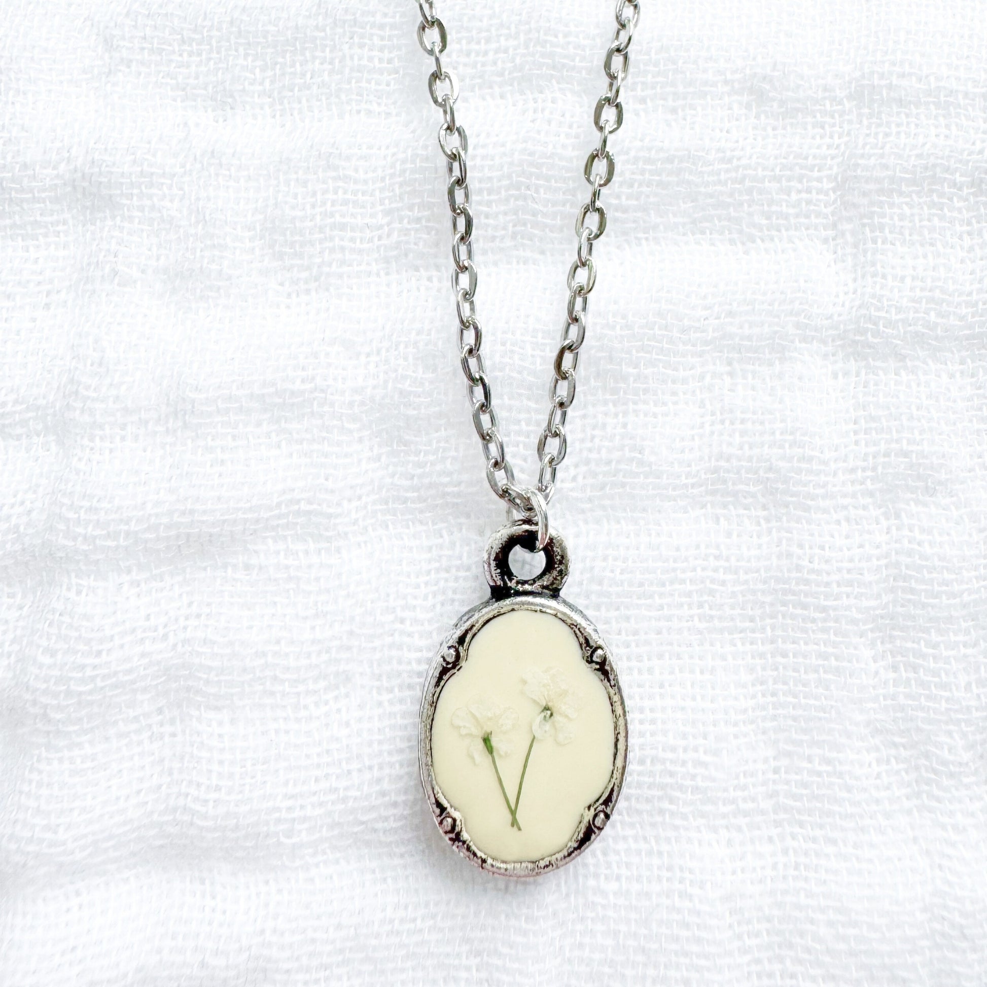 A dainty pressed flower necklace featuring a delicate pair of Queen Anne's Lace cast against a butter yellow backdrop. These real petals are housed in an elegant, antique style pendant
