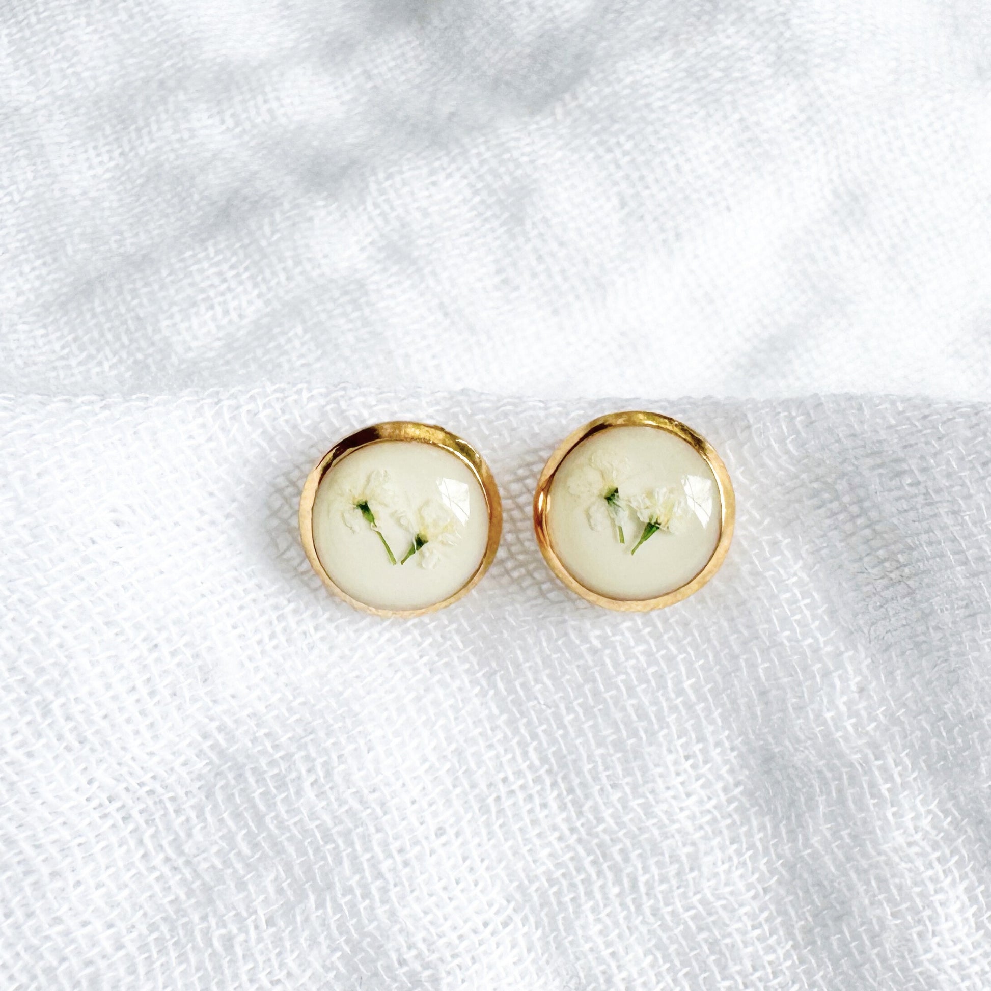 These dainty pressed flower earrings feature a pair of delicate Queen Anne's lace blooms cast against a butter yellow backdrop. These real pressed flowers are housed in classic round earring studs.