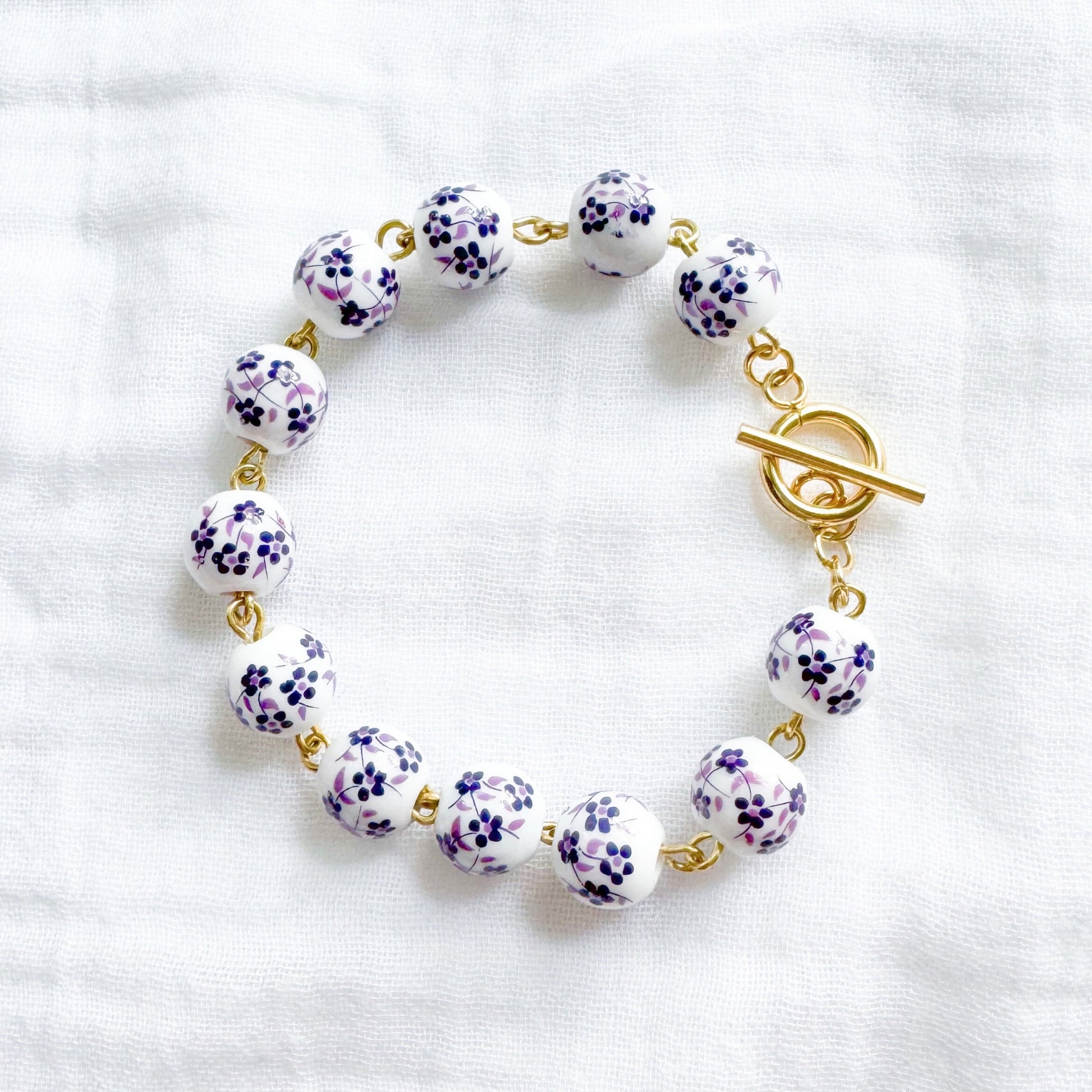 An elegant, classic bracelet made of dreamy purple floral ceramic beads. Each bead is individually wire-linked, giving a beautiful and comfortable drape to this piece.