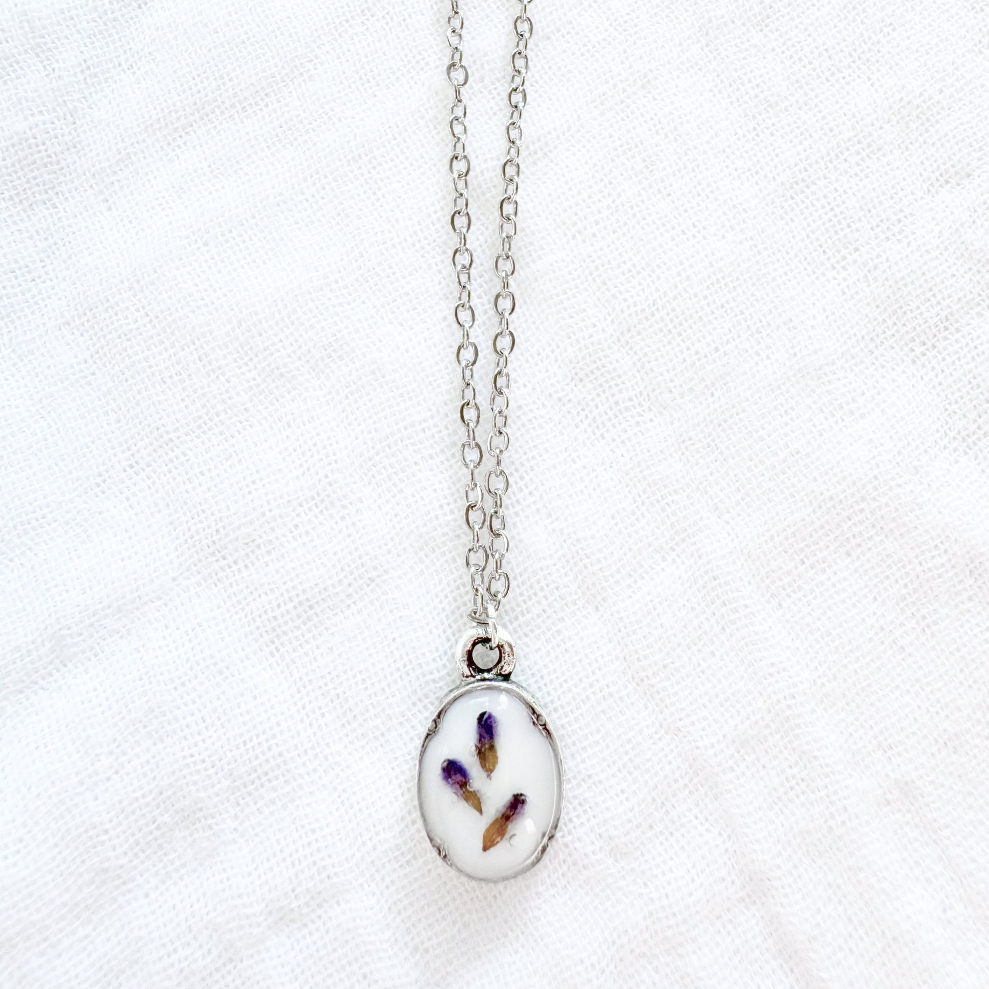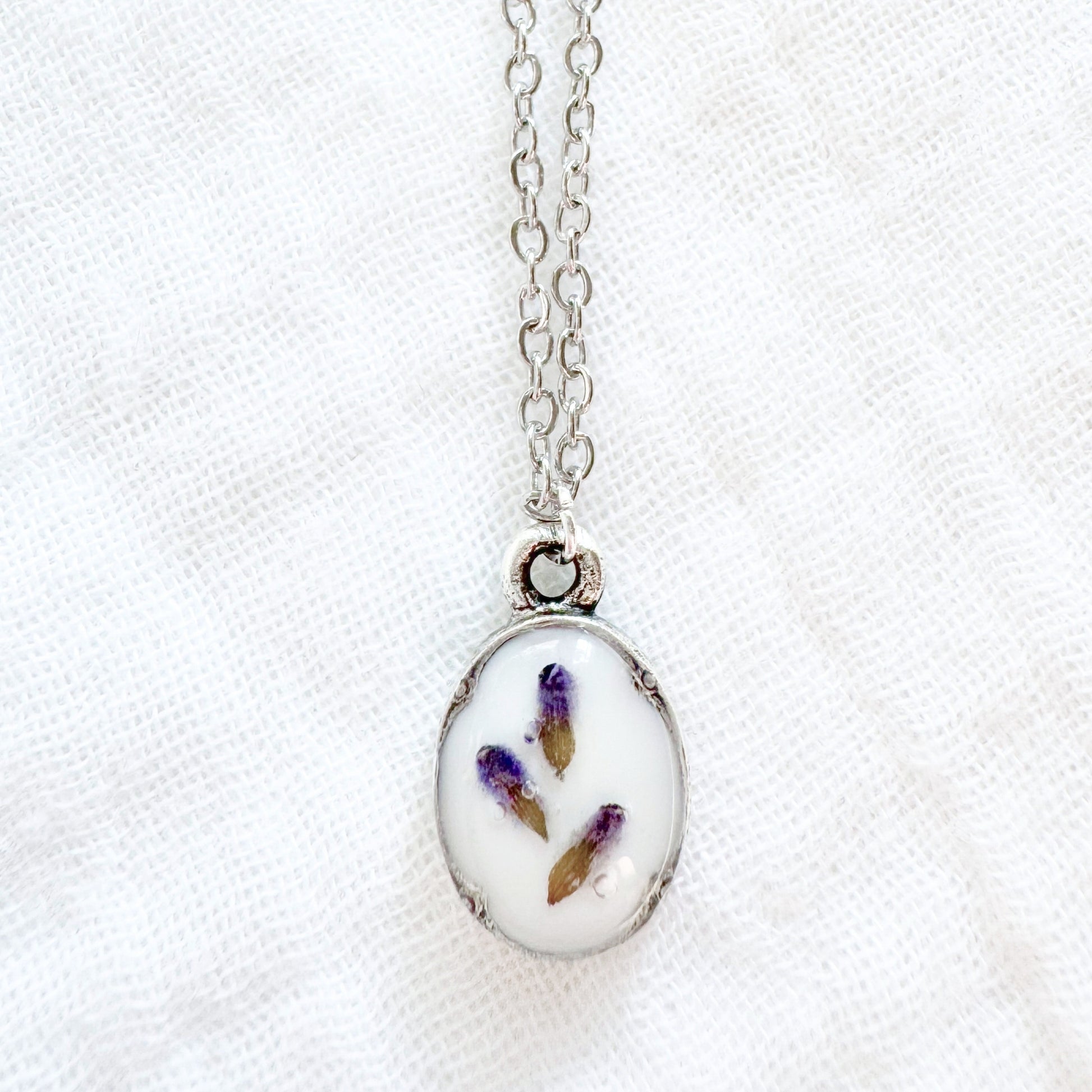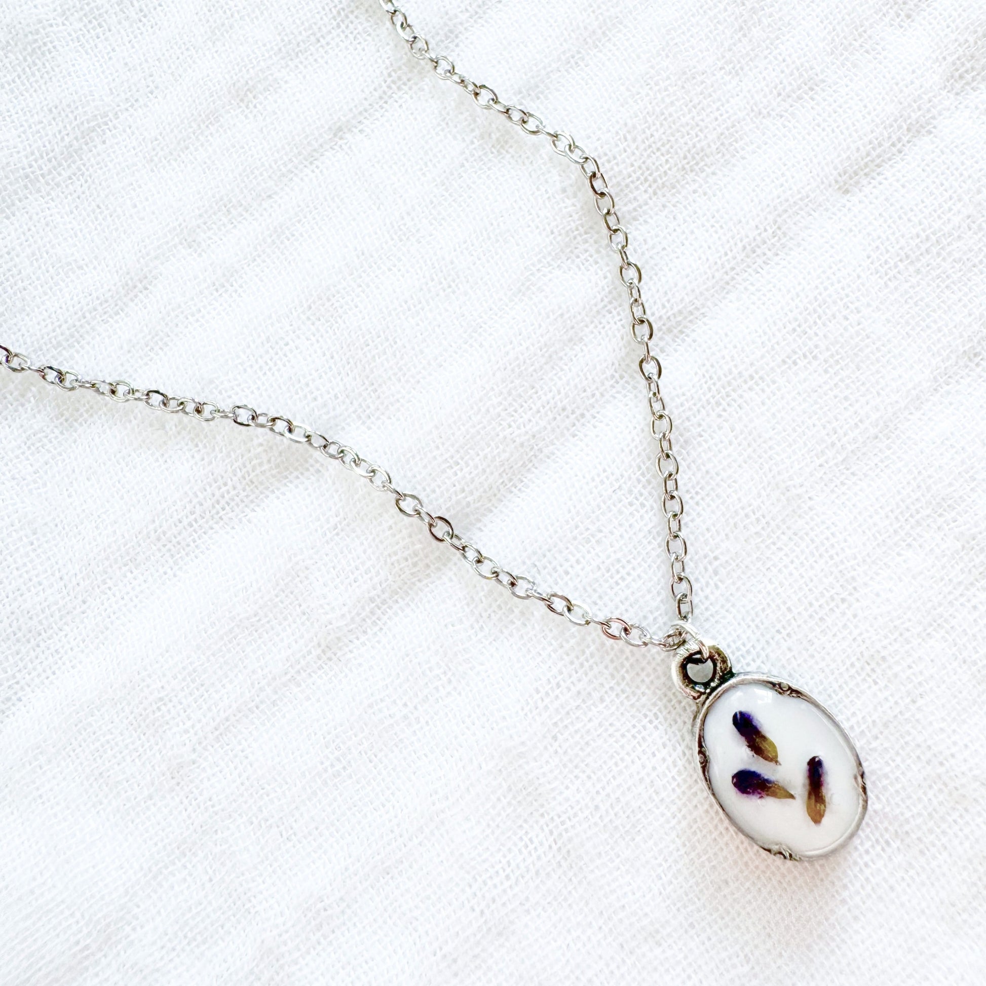 A dainty pressed flower necklace featuring a sprinkle of lavender buds from the Prince Edward County Lavender Farm, cast against a snow white backdrop. These real pressed flowers are housed in an elegant, antique style pendant.