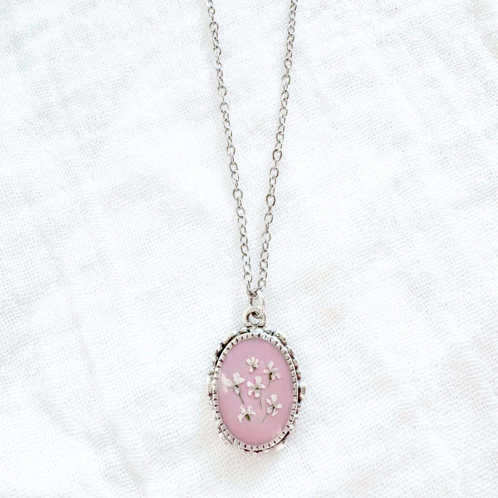 A dainty pressed flower necklace featuring six delicate Queen Anne's lace blooms cast against a pink lilac backdrop. These real pressed flowers are housed in an elegant, antique style pendant.