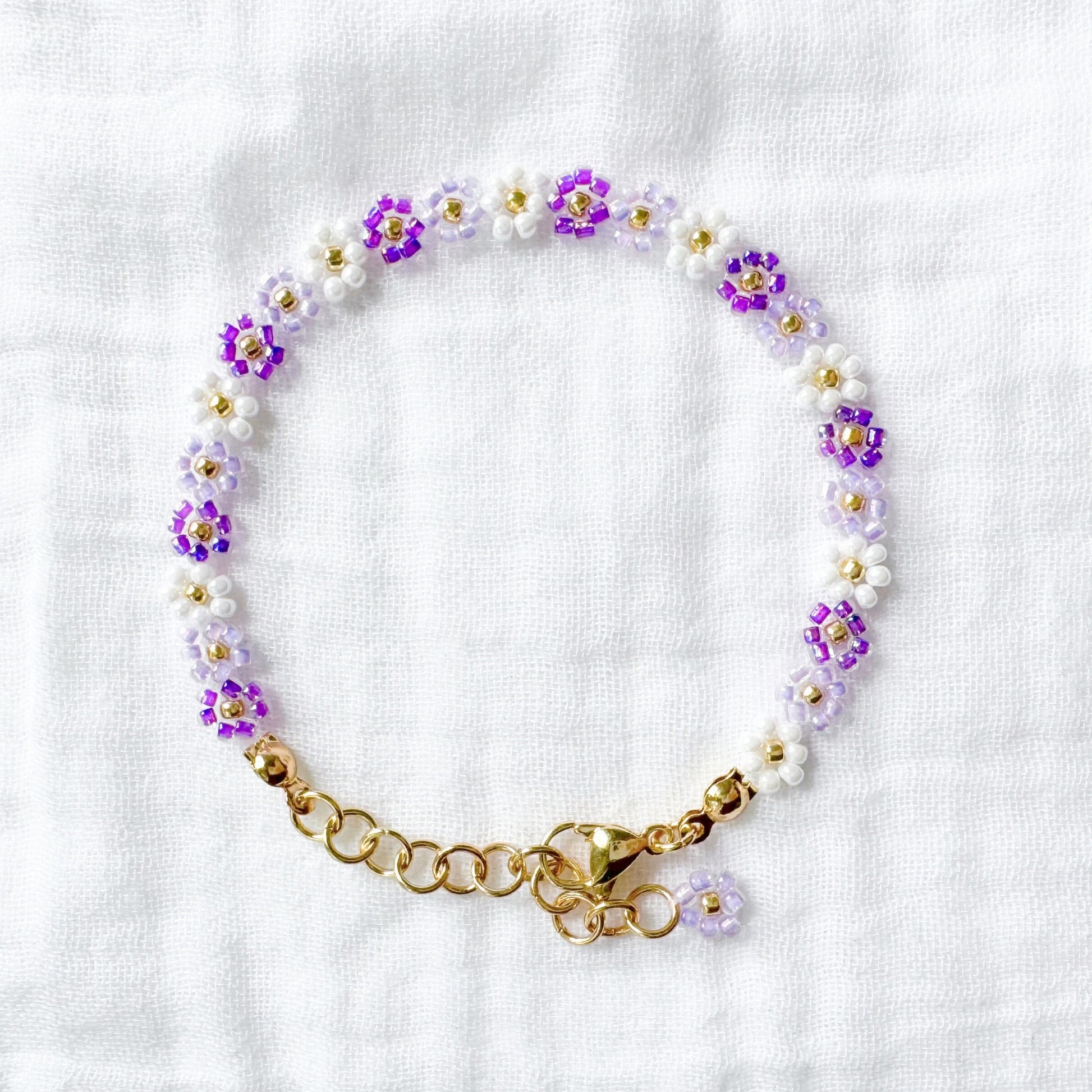 A beautiful daisy chain bracelet, handmade with dreamy lilac, lavender, white and gold glass beads. Fully adjustable for the perfect fit, it also features a singular daisy on the end of the extension chain for added charm.