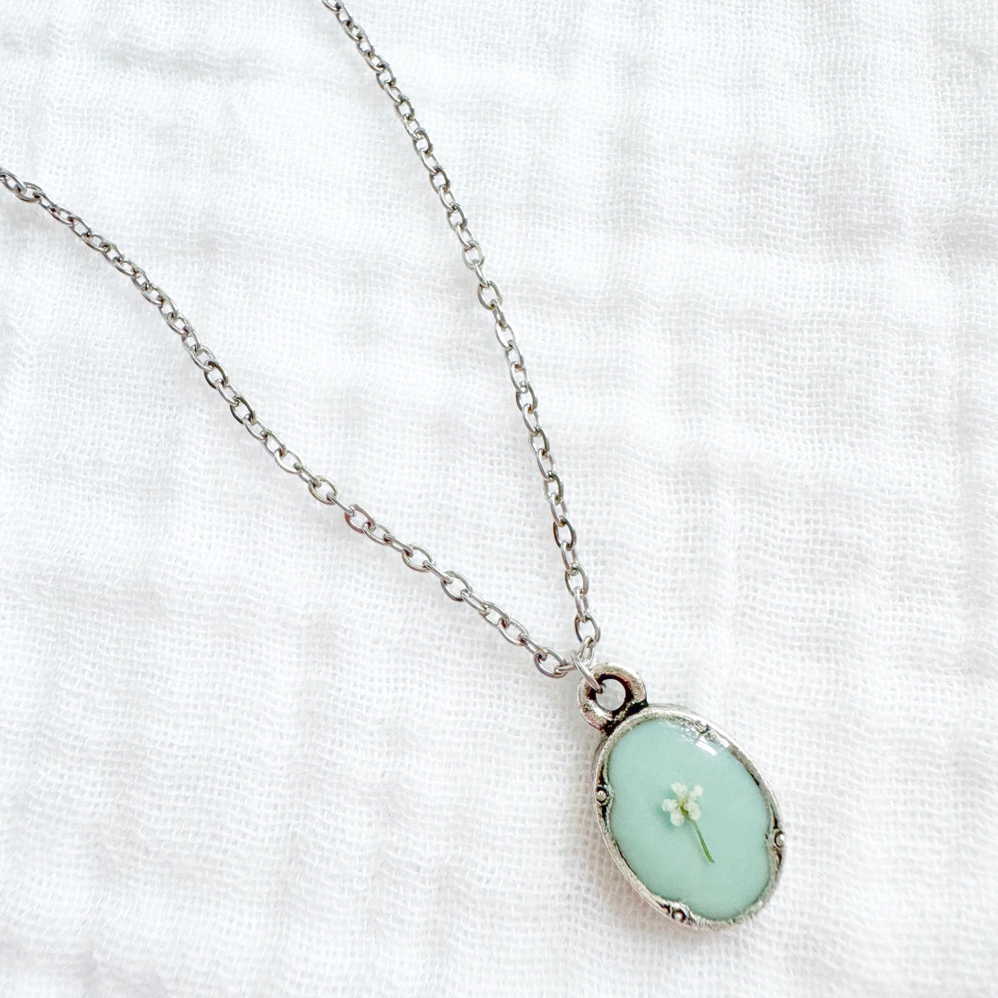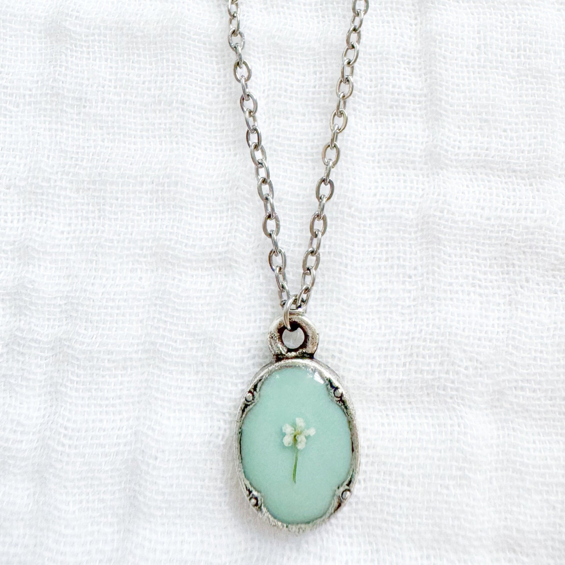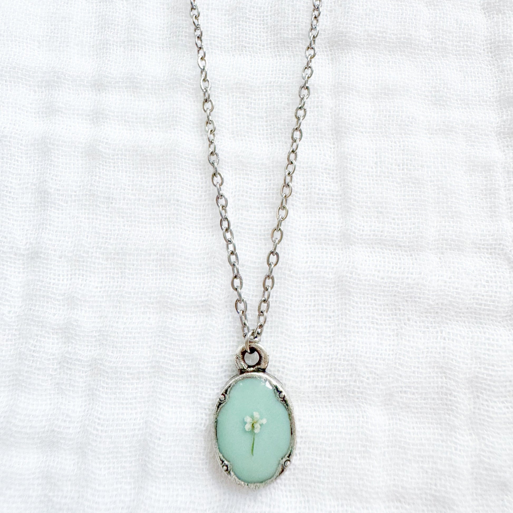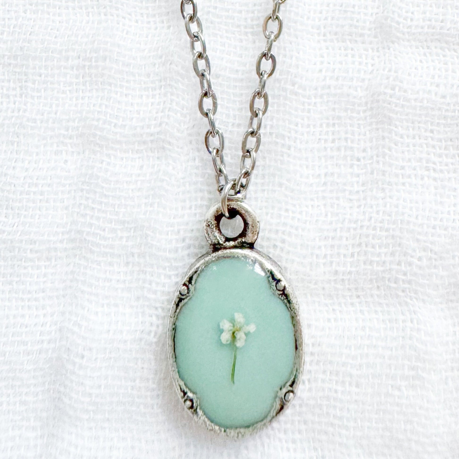 A dainty pressed flower necklace featuring a delicate Queen Anne's lace bloom cast against a light seafoam backdrop. These real pressed flowers are housed in an elegant, antique style pendant.