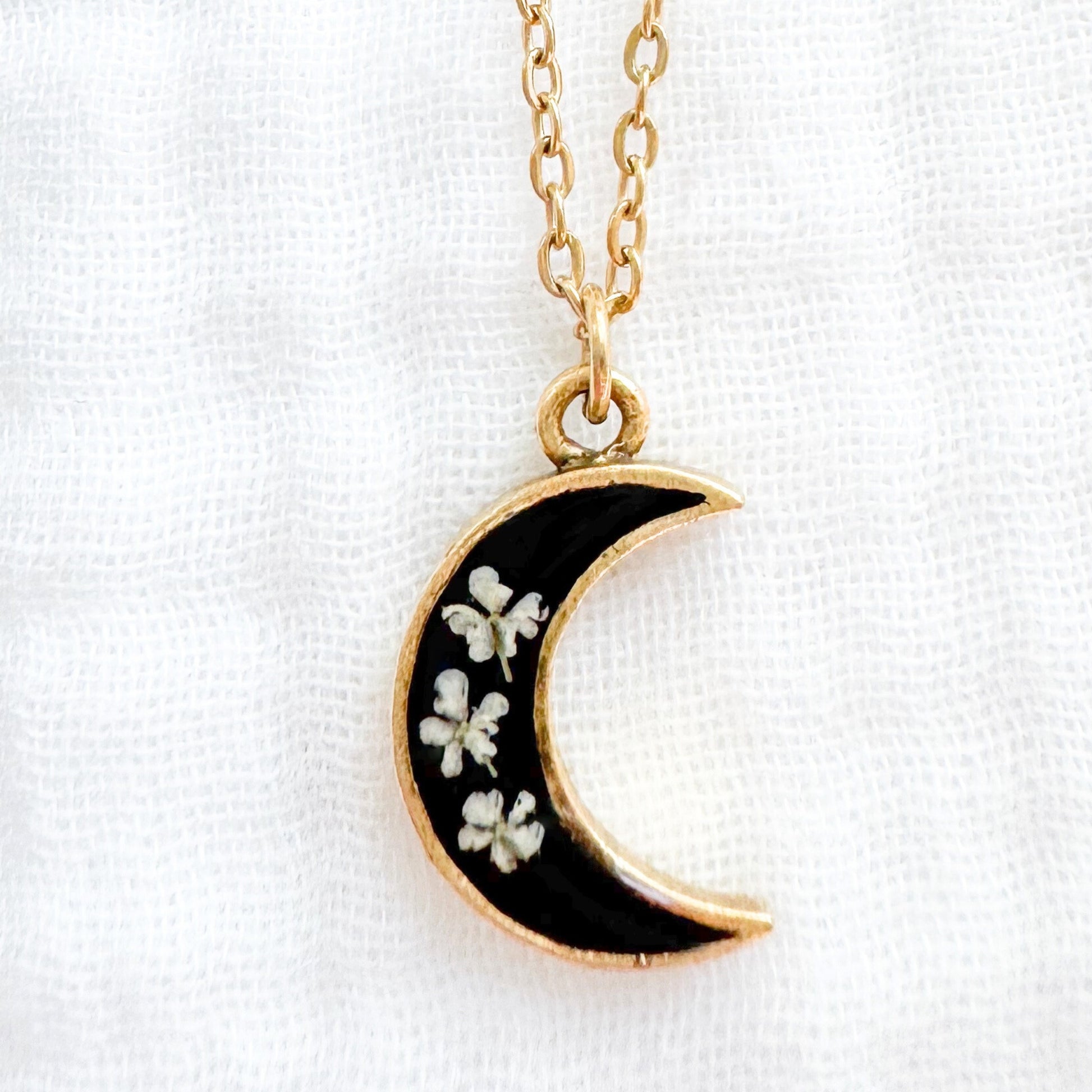 A magical pressed flower necklace featuring a trio of delicate Queen Anne's lace cast against an onyx black moon. These real pressed flowers are housed in an elegant, antique style pendant.