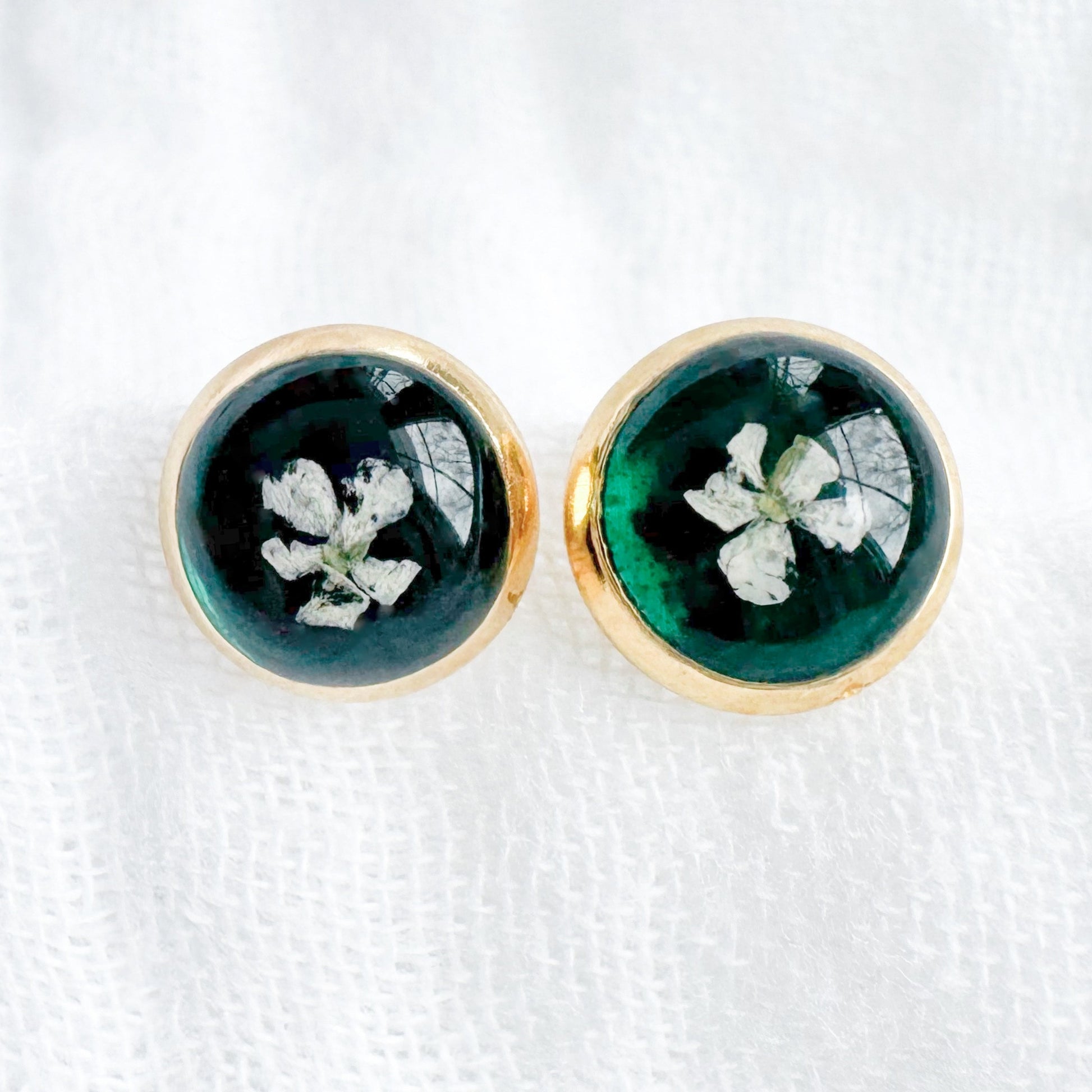 These dainty pressed flower earrings feature a delicate Queen Anne's lace bloom cast against a shimmering hunter green backdrop. These real pressed flowers are housed in classic round earring studs.
