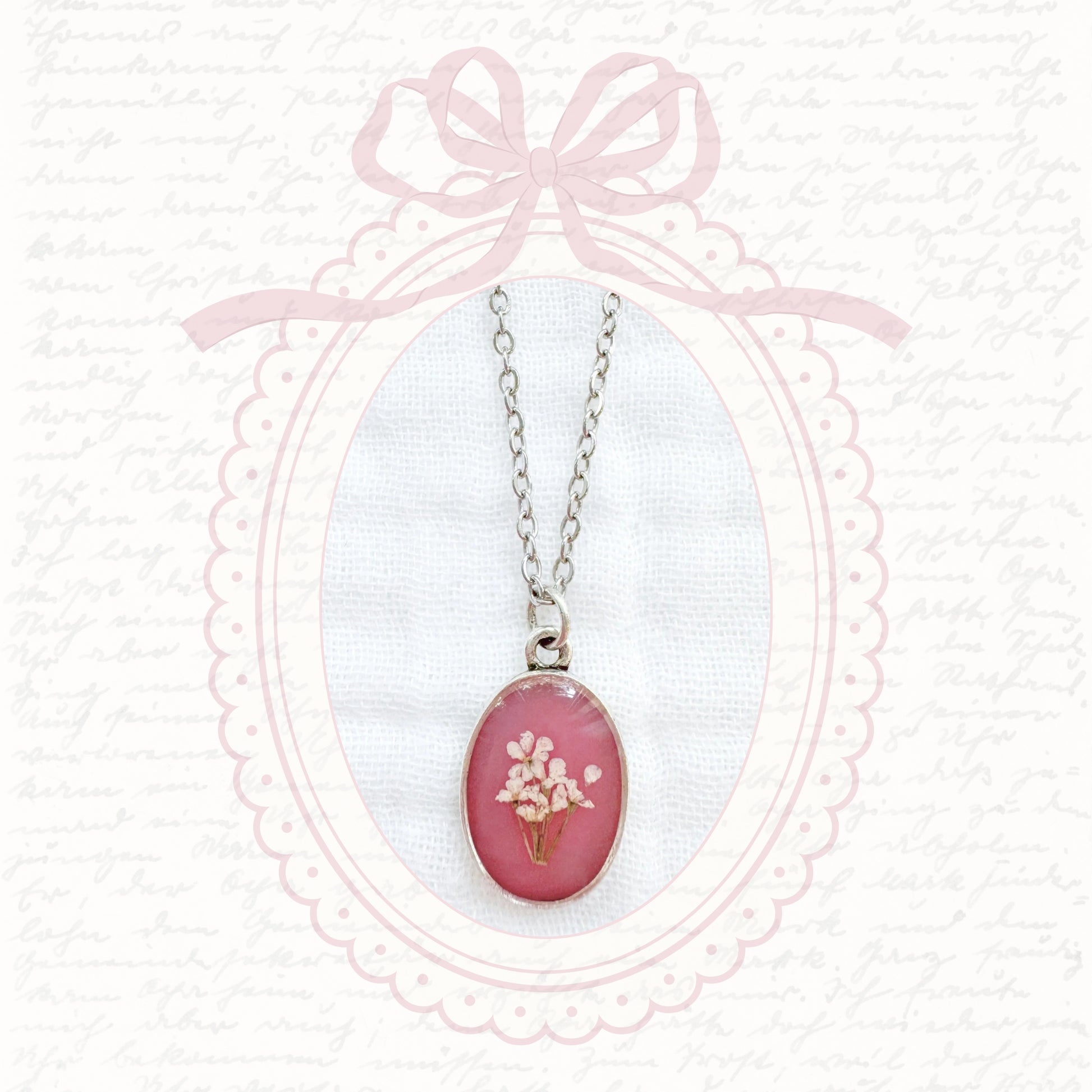 A dainty pressed flower necklace featuring a bouquet of Queen Anne's lace cast against a rosy pink backdrop. These real pressed flowers are housed in a classic oval pendant.