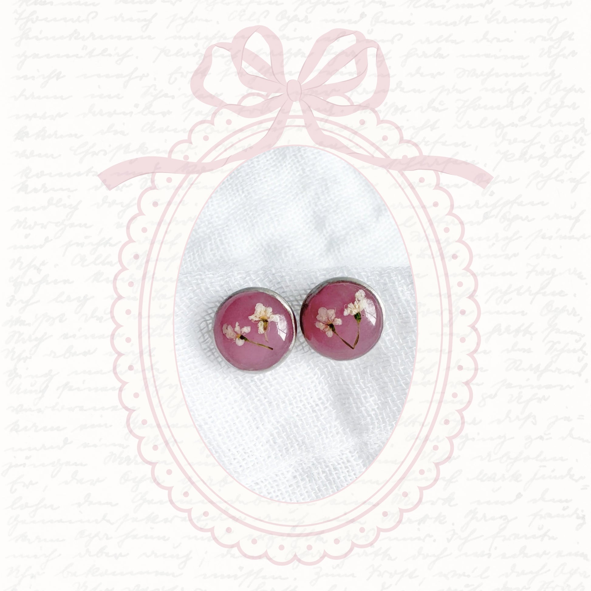 These dainty pressed flower earrings feature a pair of delicate Queen Anne's lace cast against a rosy pink backdrop. These real pressed flowers are housed in classic round earring studs.