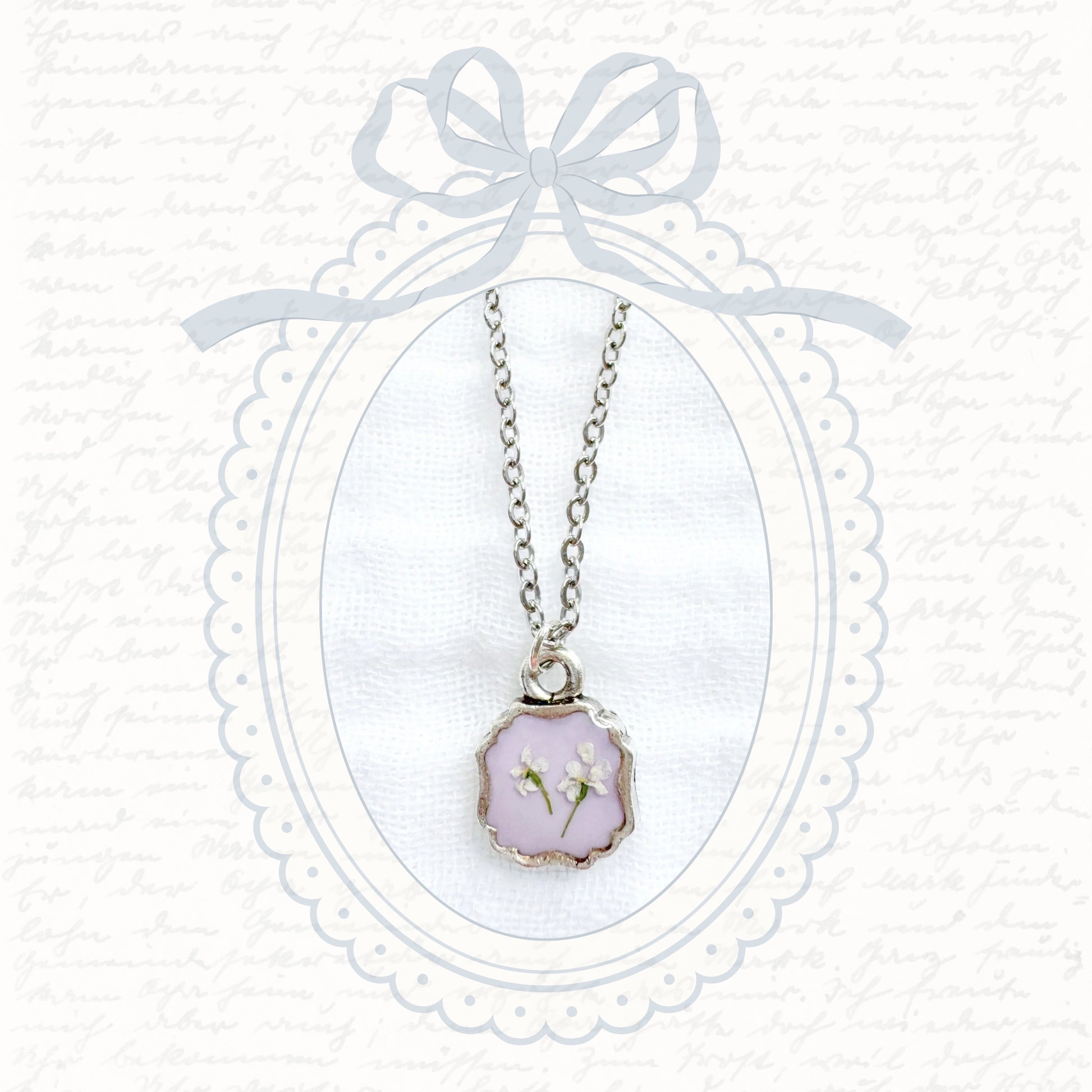 A dainty pressed flower necklace featuring a pair of delicate Queen Anne's lace cast against a soft lilac backdrop. These real pressed flowers are housed in an elegant, antique style pendant.