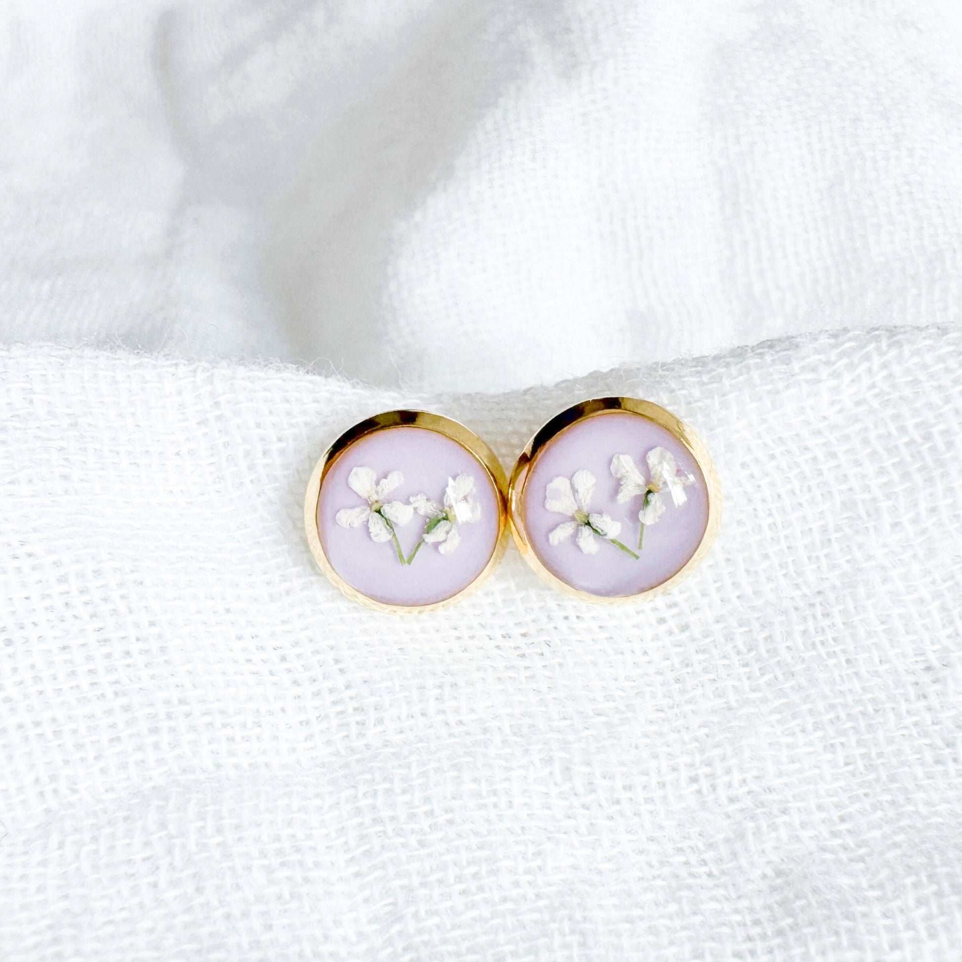 These dainty pressed flower earrings feature a delicate pair of Queen Anne's lace blooms cast against a soft lilac backdrop. These real pressed flowers are housed in classic round earring studs.
