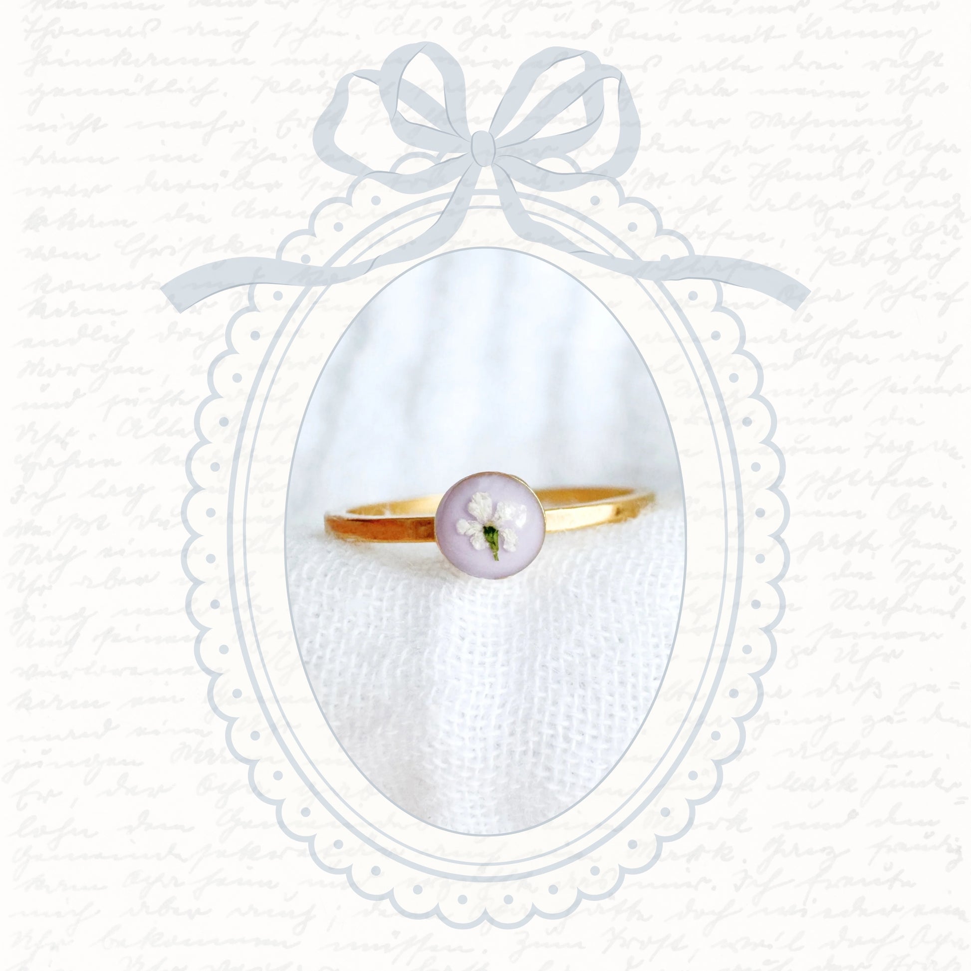 This dainty pressed flower stacking ring features a single delicate Queen Anne's lace bloom cast against a soft lilac backdrop. These real pressed petals are housed in a classic solitaire setting.