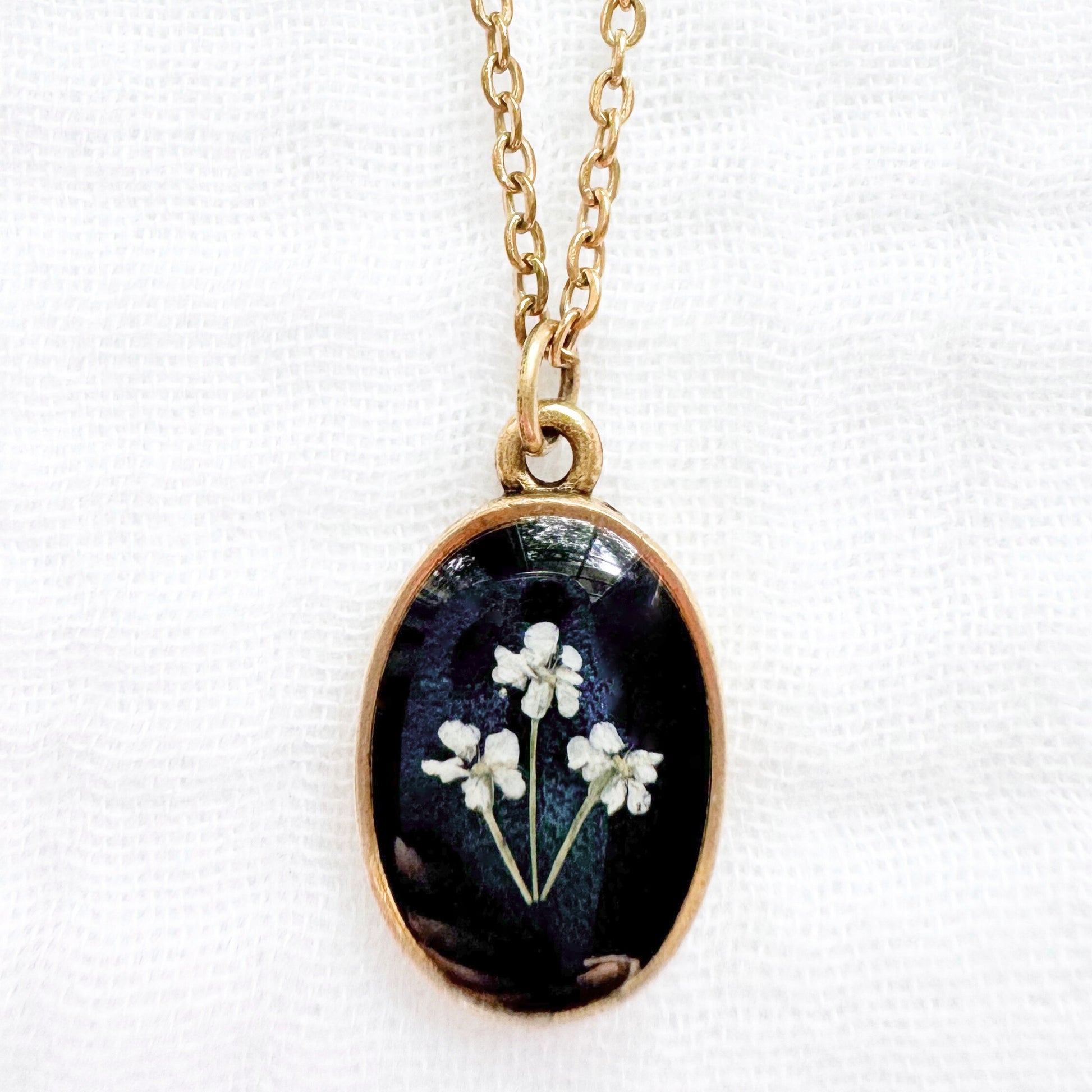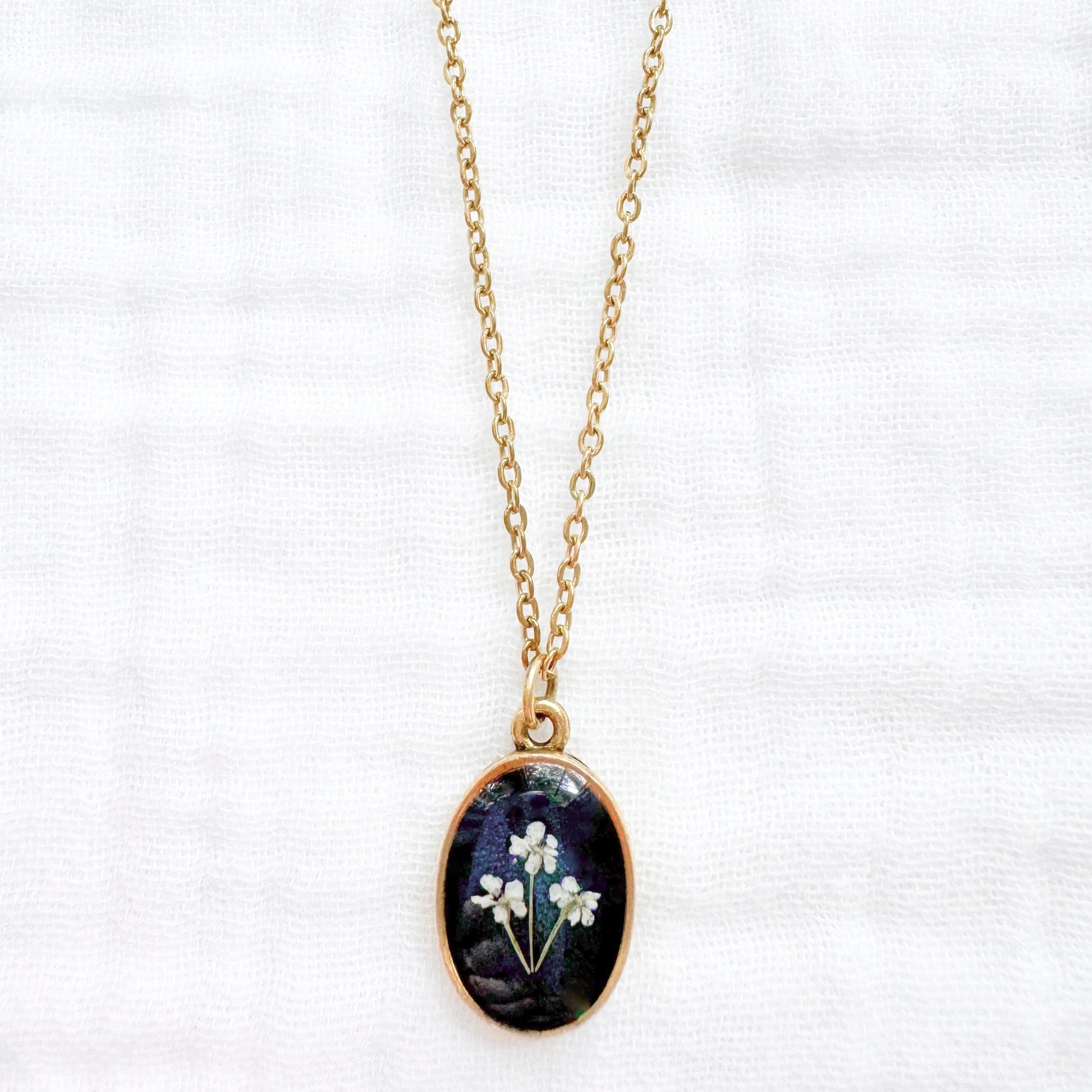 A dainty pressed flower necklace featuring a trio of Queen Anne's lace blooms cast against a shimmering ocean blue backdrop. These real pressed flowers are housed in a classic oval pendant.