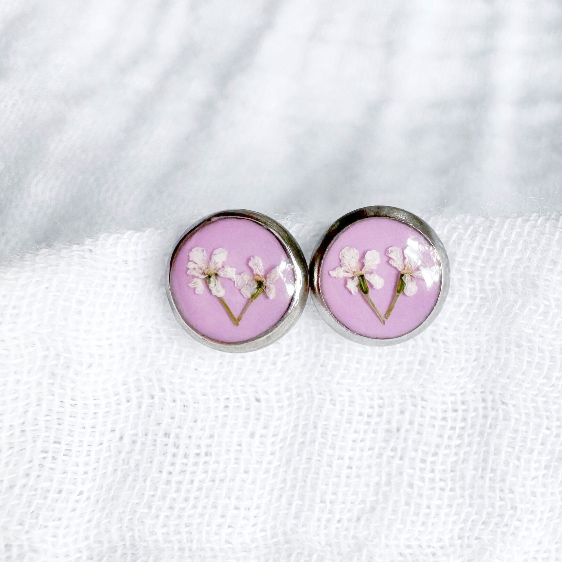These dainty pressed flower earrings feature a delicate pair of Queen Anne's lace cast against a retro orchid backdrop. These real pressed flowers are housed in classic round earring studs.