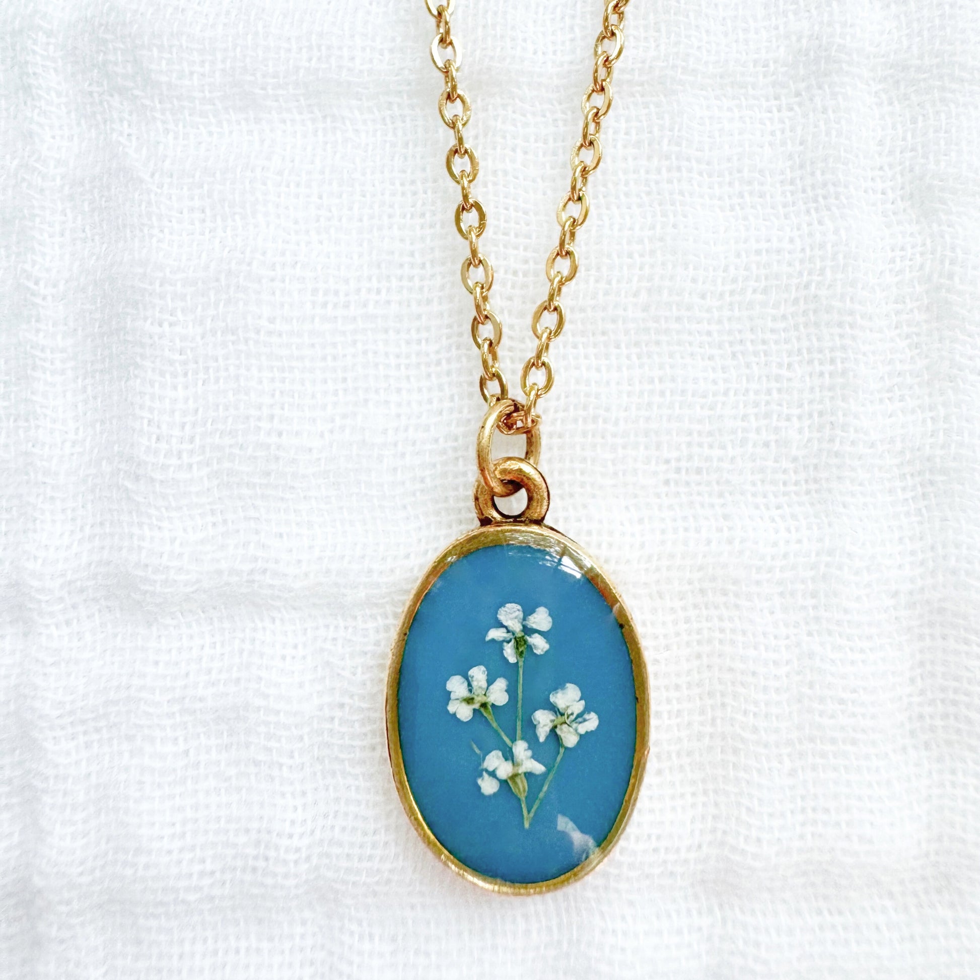 A dainty pressed flower necklace featuring a field of Queen Anne's lace cast against a romantic cerulean backdrop. These real pressed flowers are housed in a classic oval pendant.