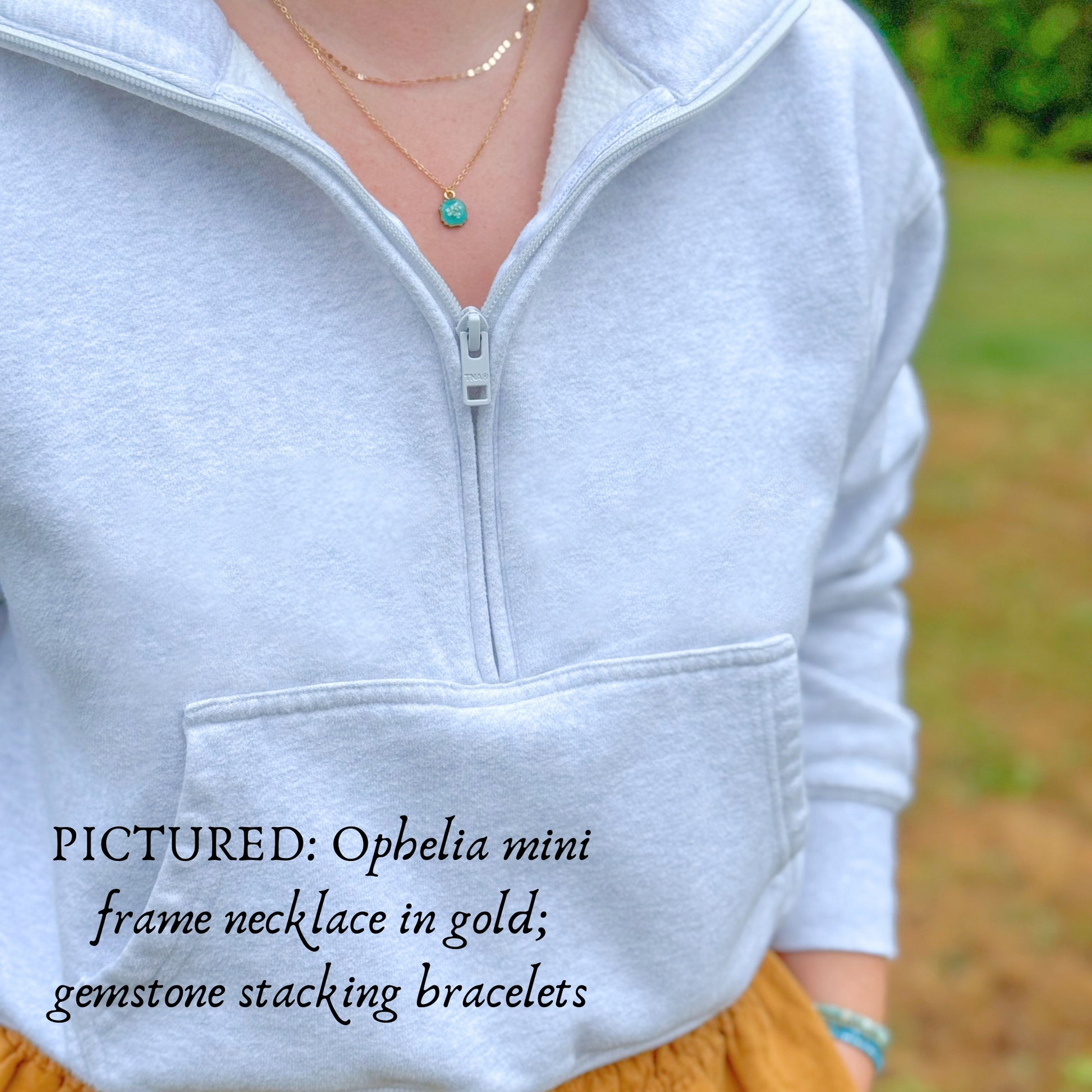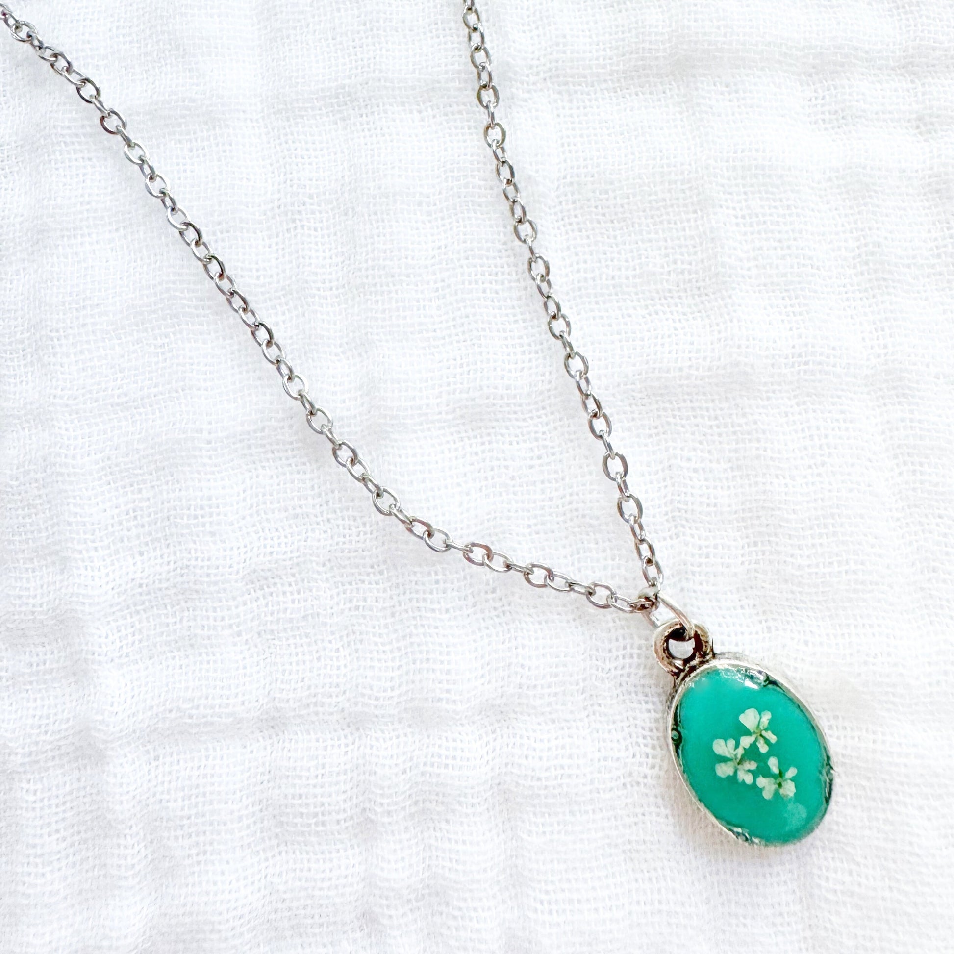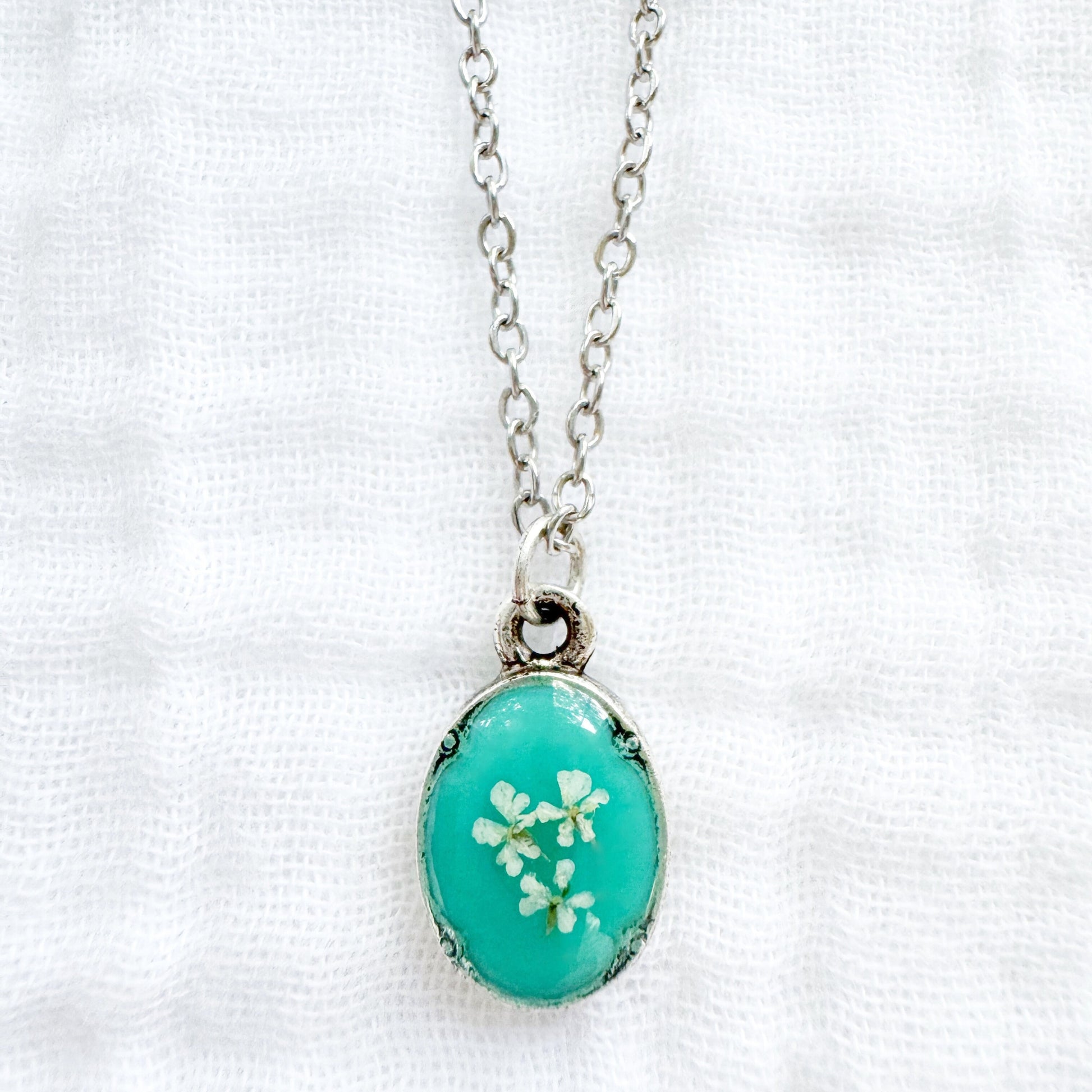 Part of the Showgirl Collection and inspired by Taylor Swift's upcoming album, this dainty pressed flower necklace features a cluster of Queen Anne's Lace blooms cast against a watery aqua backdrop. These real petals are housed in an elegant, antique style pendant.