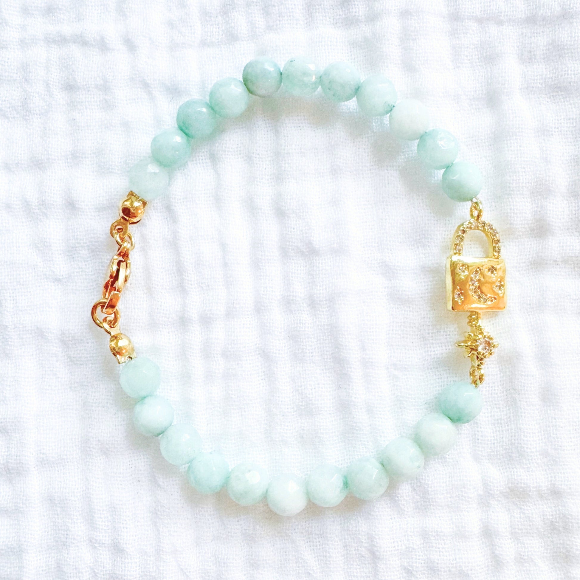 This shimmering piece features colour-enhanced aqua quartzite, a semi-precious stone known for strength and resilience, while the the 18k gold plated mystic lock charm with cubic zirconia adds both glamour and a sense of mystery. Embrace your showgirl era with this jewel-toned bracelet!