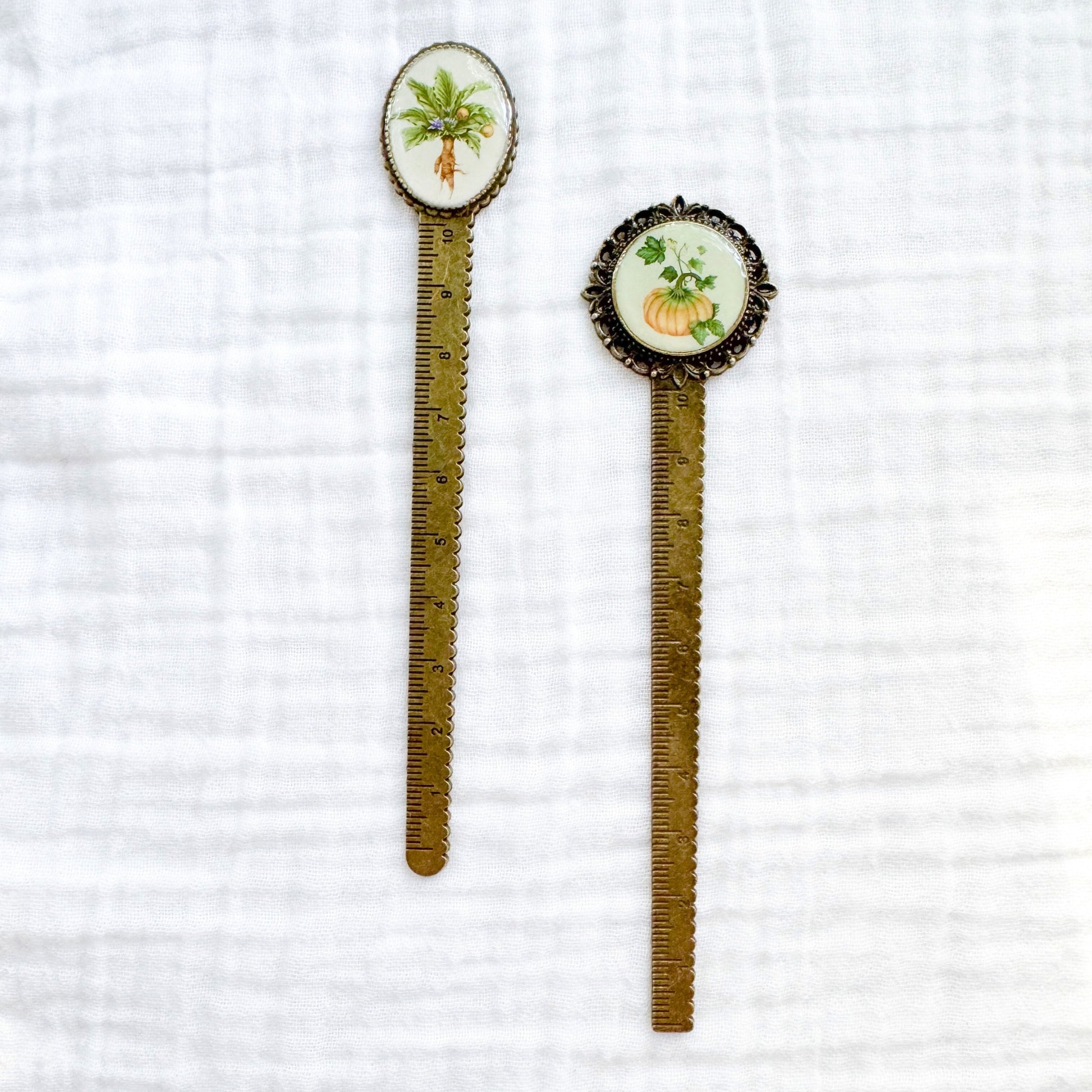 A charming, magical bookmark featuring a print of Chelsea's original Pumpkin botanical illustration housed in an antique frame.