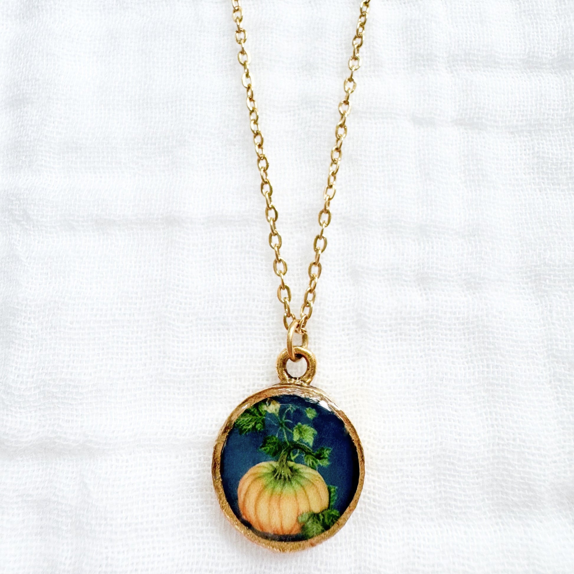 Carry the coziness of fall with this beautiful pumpkin pendant necklace. It features a print of Chelsea's original Pumpkin botanical illustration, housed in a hammered antique-style pendant.