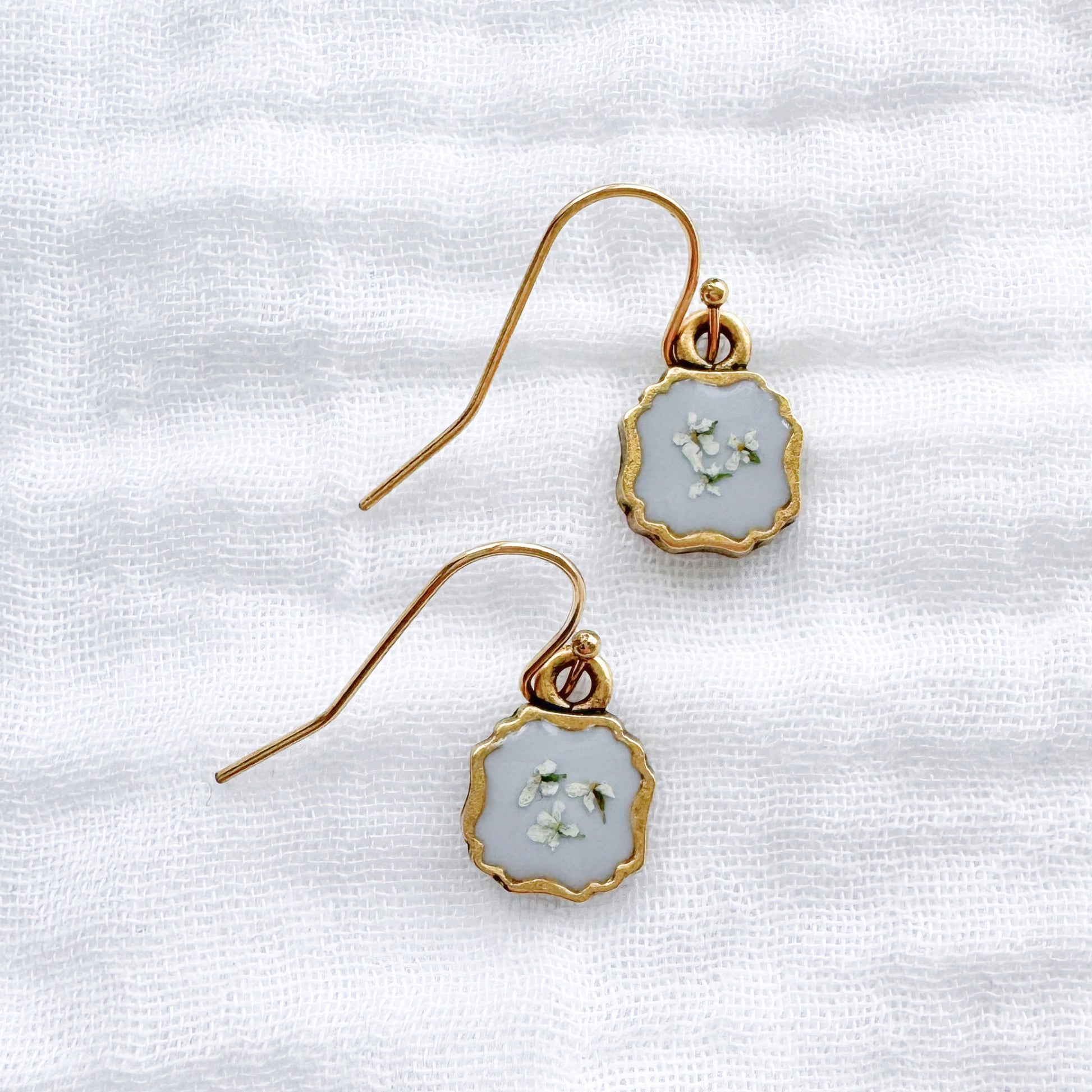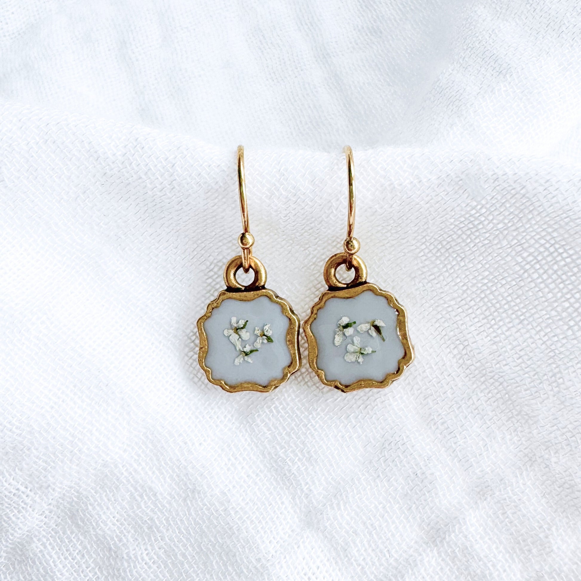 This pair of dainty pressed flower drop earrings features a cluster of delicate Queen Anne's lace blooms cast against a vintage, dusty-blue backdrop. These real pressed flowers are housed in an elegant, antique style frame and dangle delicately from French hooks.