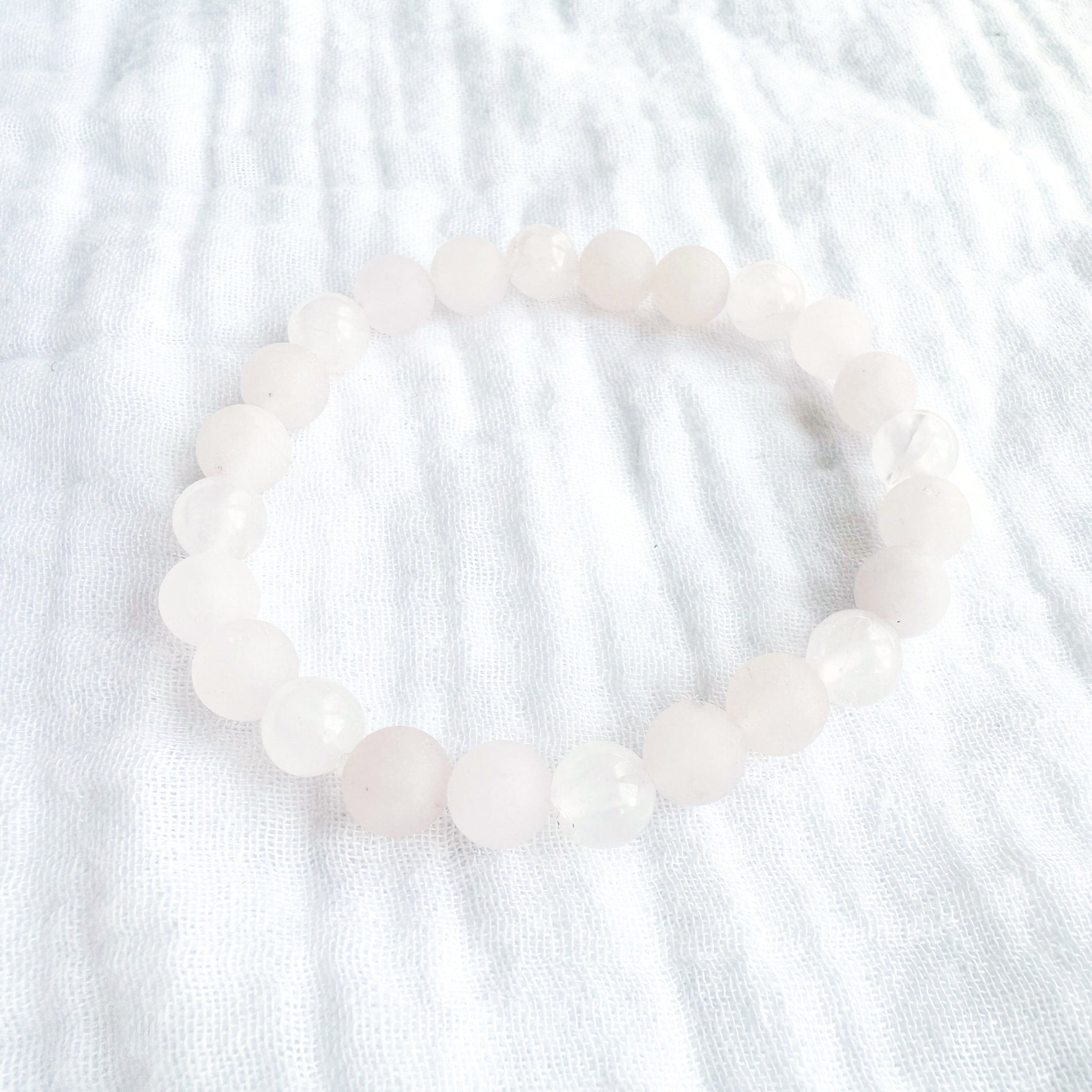 Wear the energy of the earth with this gorgeous natural gemstone bracelet. Made with a combination of semi-precious frosted and polished rose quartz stone beads.