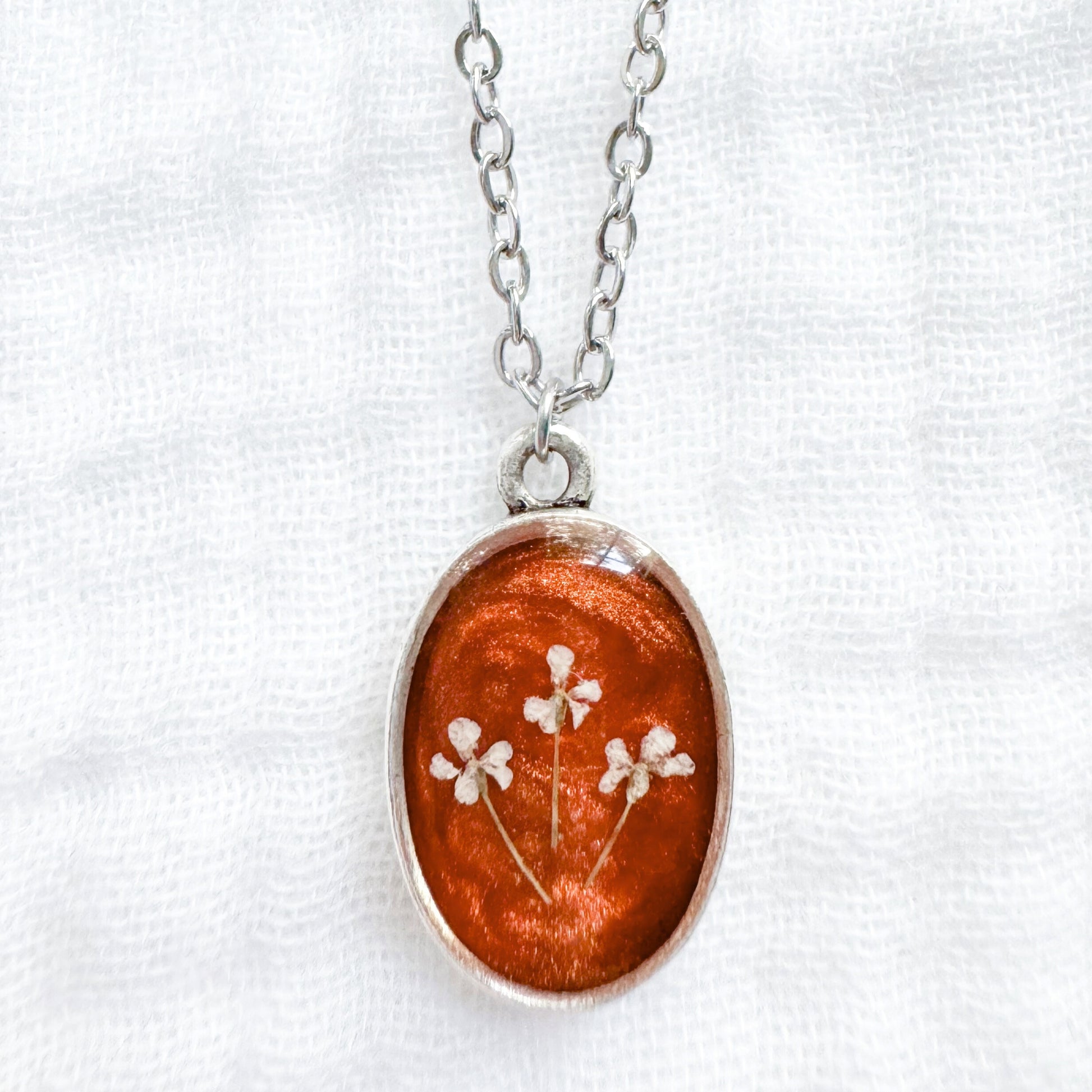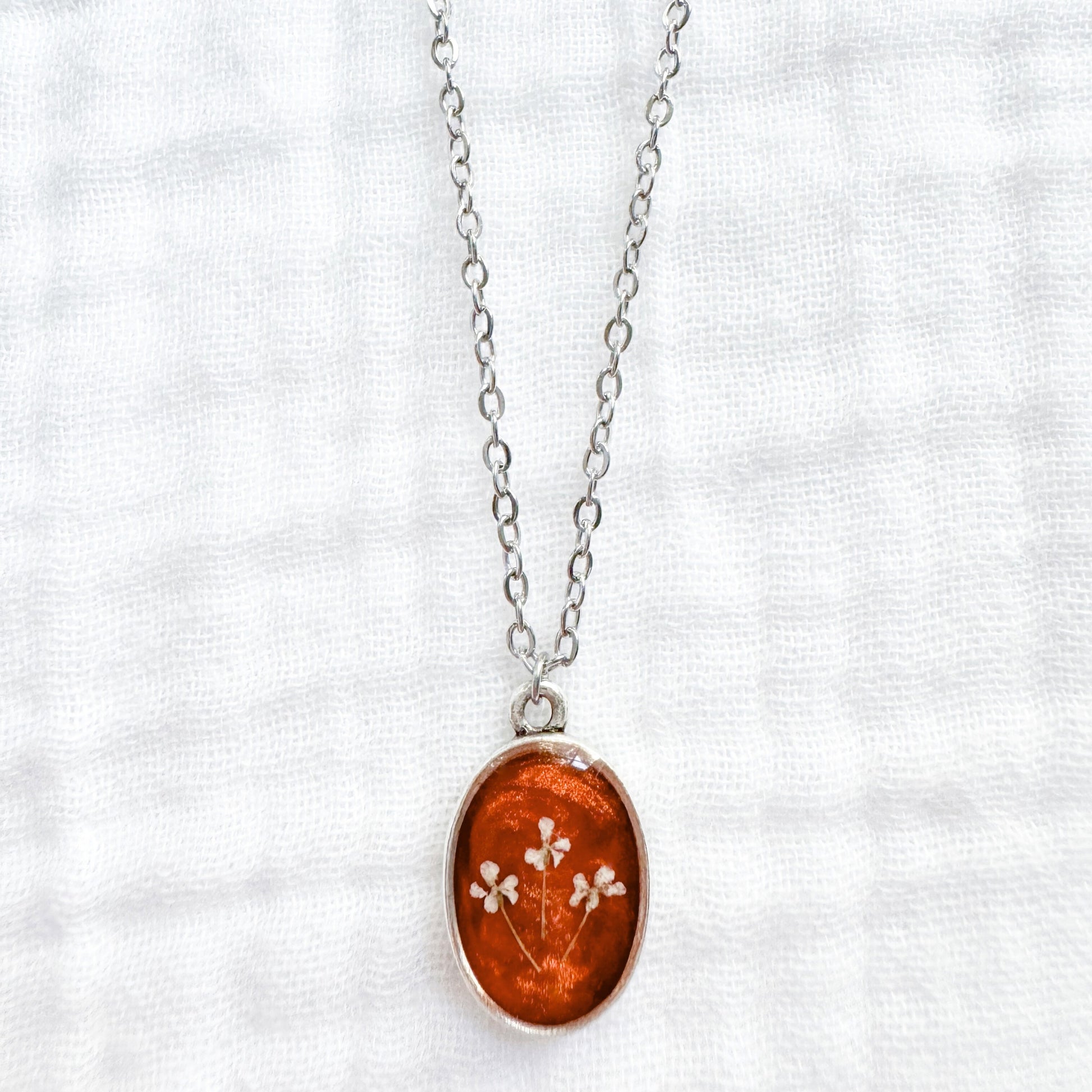 A dainty pressed flower necklace featuring a trio of Queen Anne's lace cast against a shimmering orange backdrop. These real pressed flowers are housed in a classic oval pendant.
