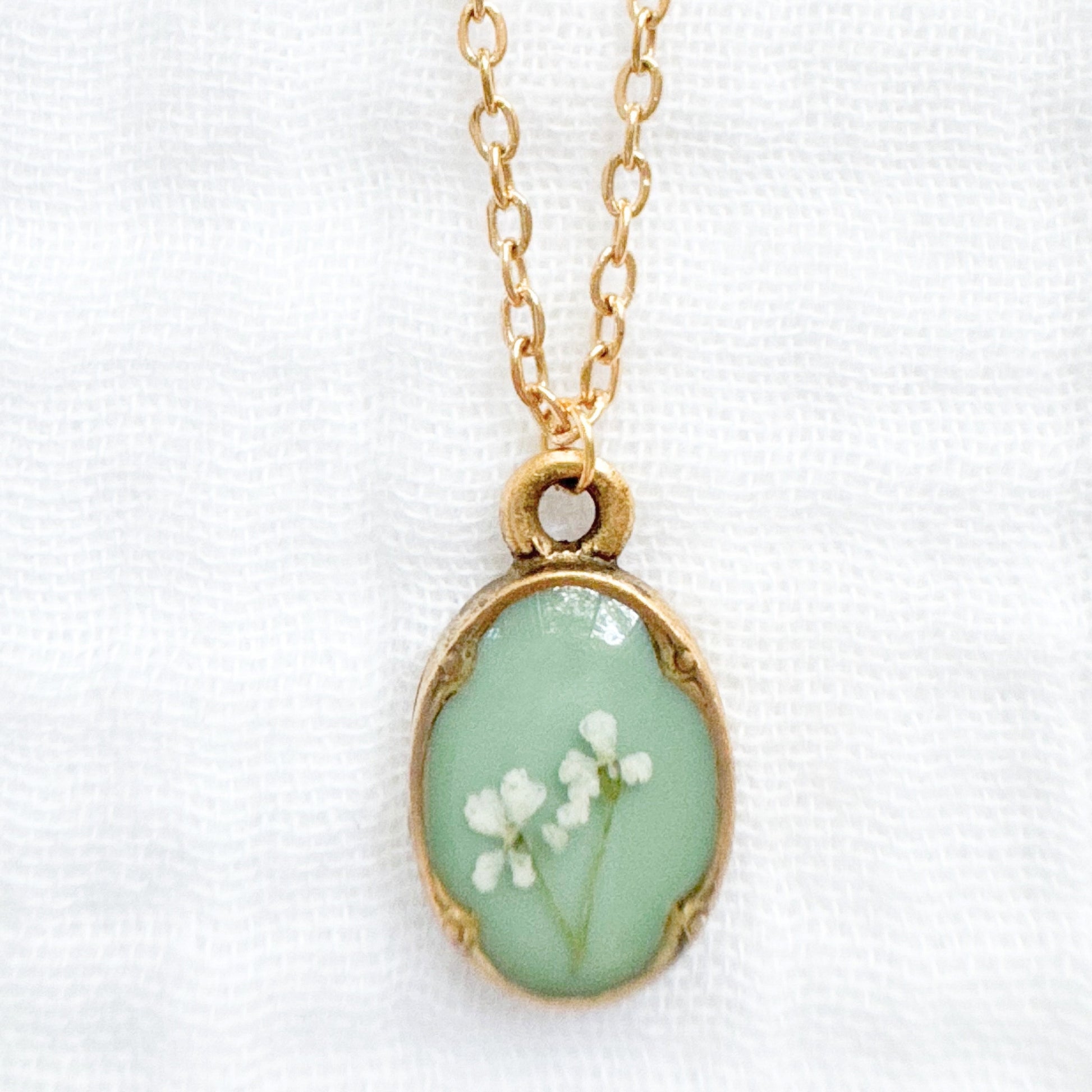 A dainty pressed flower necklace featuring a pair of delicate Queen Anne's lace cast against a fern green backdrop. These real pressed flowers are housed in an elegant, antique style pendant.
