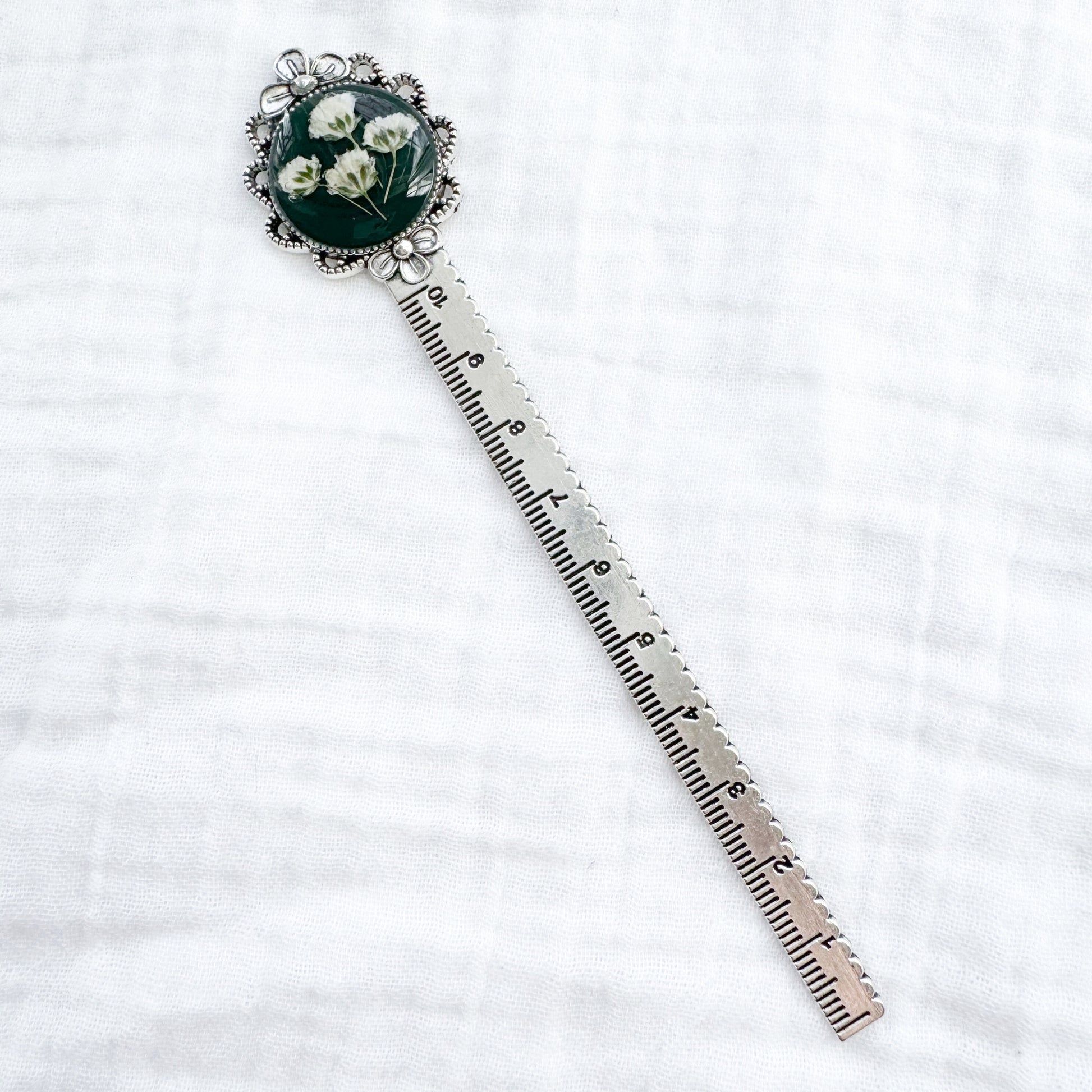 A charming pressed flower bookmark featuring white wildflowers or baby's breath cast against a deep green backdrop. Bring the warmth of nature and delicate beauty of flowers to your favourite pages.