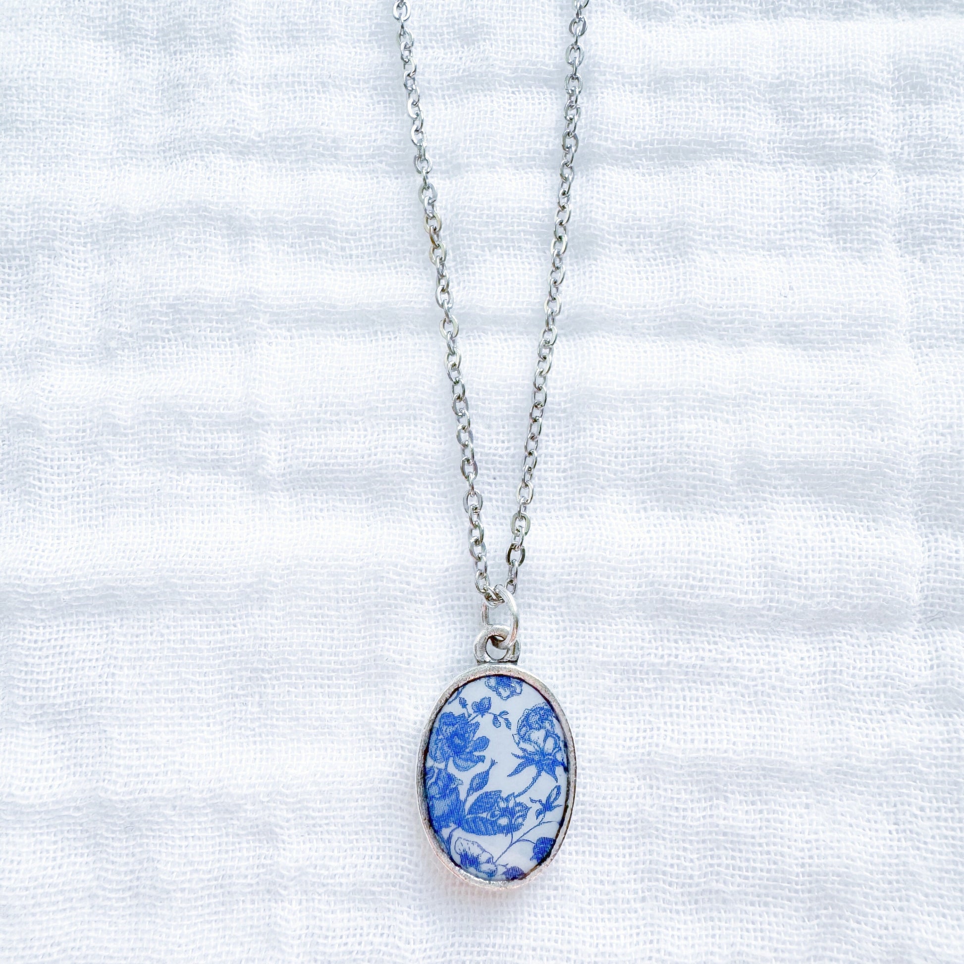 A classic oval pendant necklace featuring an indigo blue toile pattern with flowers and moths, housed in an elegant, antique style pendant.