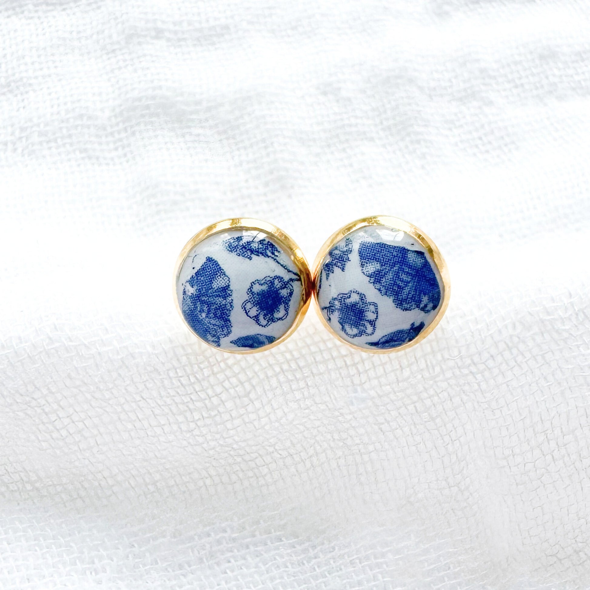 This pair of dainty earrings features an indigo blue toile pattern with florals and moths, housed in classic round earring studs.